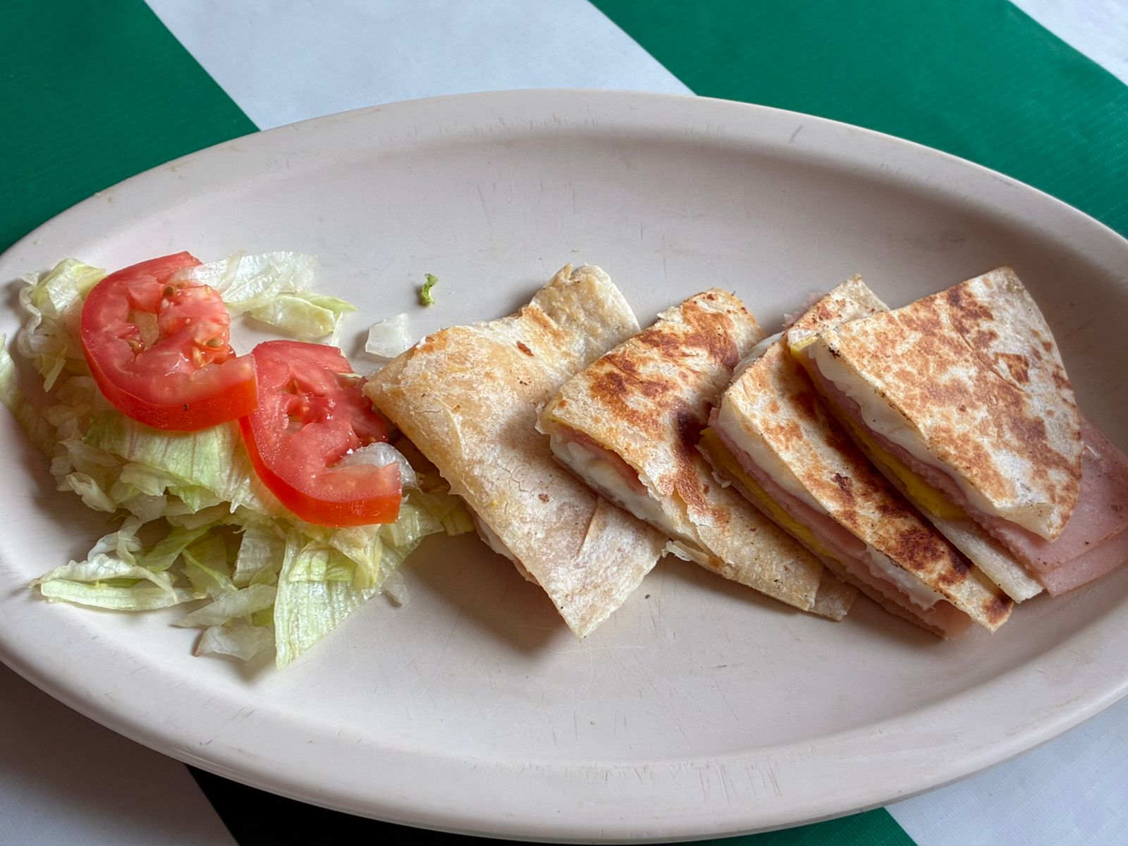 Dos tortillas de harina rellenas con jamón y queso (60 g), fundido, doradas al comal hasta obtener un dorado perfecto.