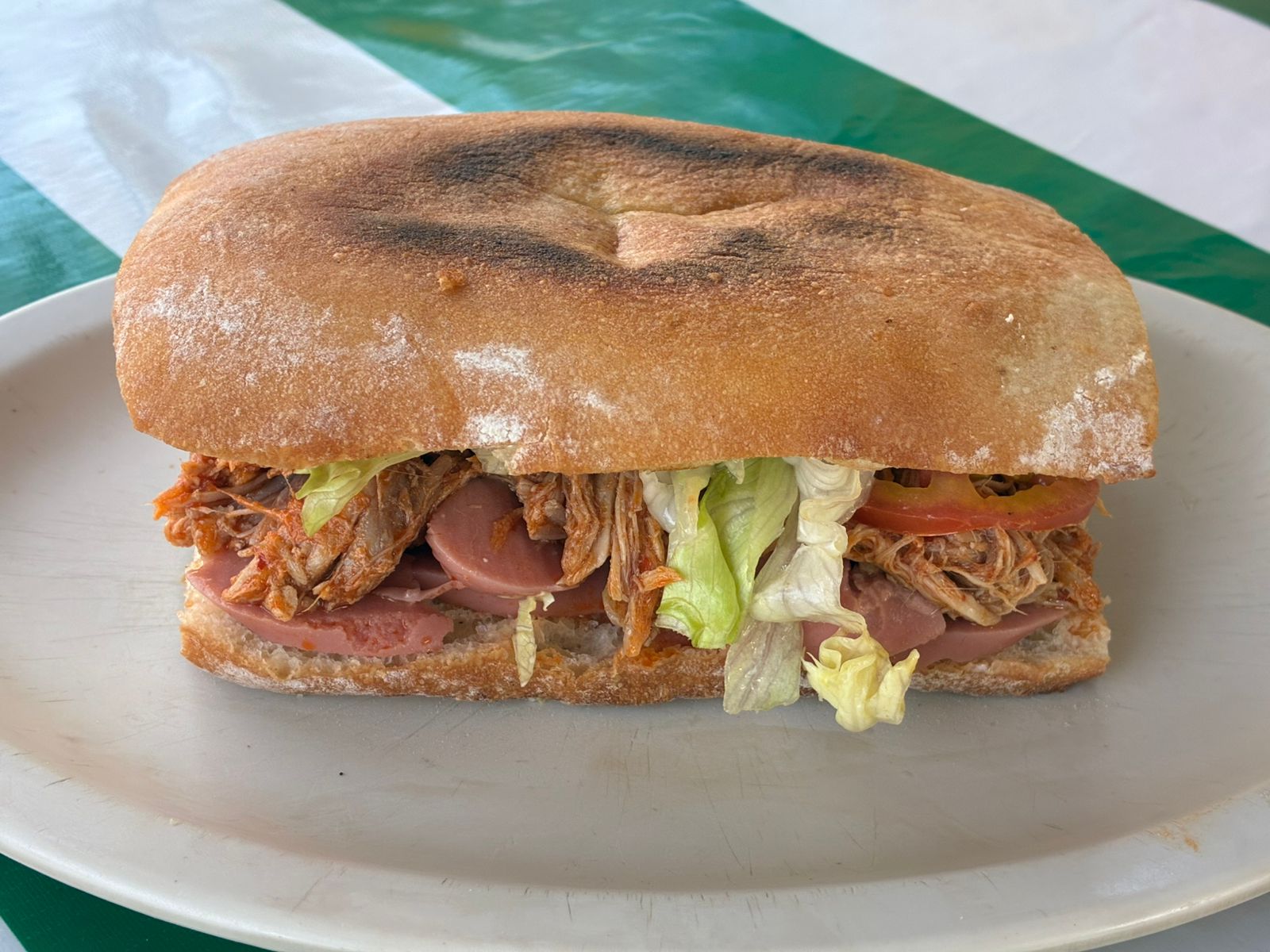Pan crujiente relleno con lomo de puerco (100 g), enchilado, sazonado con especias y chile seco. Se acompaña con jitomate fresco, cebolla, lechuga