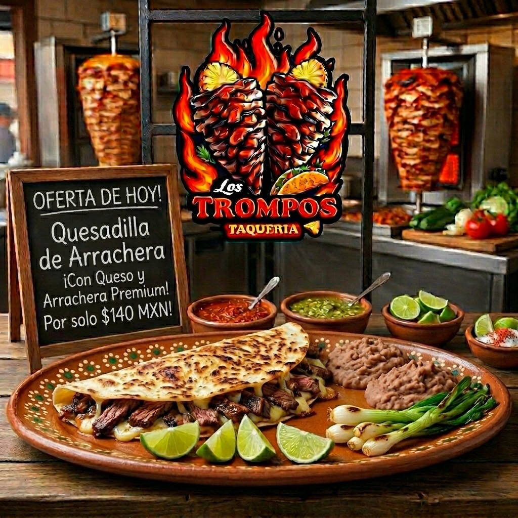 Quesadilla de Arrachera: ¡Puro Poder! Si buscas algo que de verdad te llene, esta es la elegida. Una combinación monstruosa de sabor y tamaño que no se anda con juegos. * Tortilla de 180g: Una base gigante, doradita y resistente. * 150g de Arrachera: Carne de primera, jugosa y recién salida de la parrilla. * Mucho Queso: Fundido a la perfección para unirlo todo. ¡Más de 300 gramos de puro sabor! E