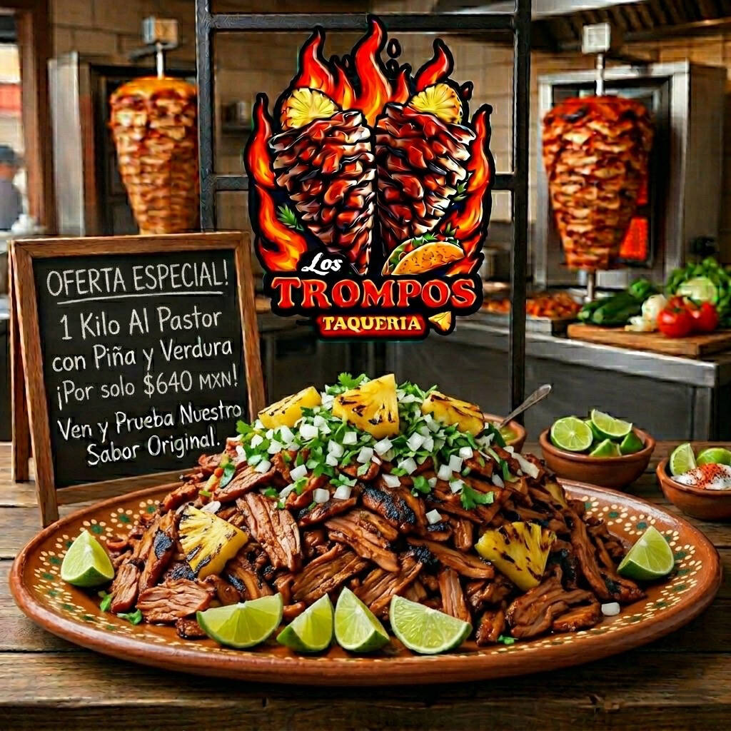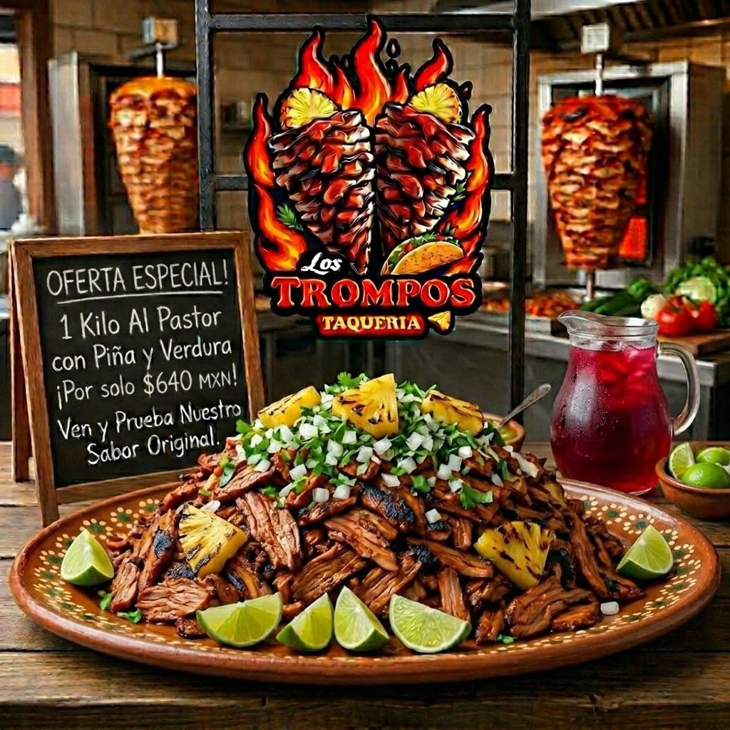 Kilo de Pastor con Todo Deliciosa carne al pastor (1 kg) acompañada de piña, cebollitas asadas, tortilla y una porción de tostadas.