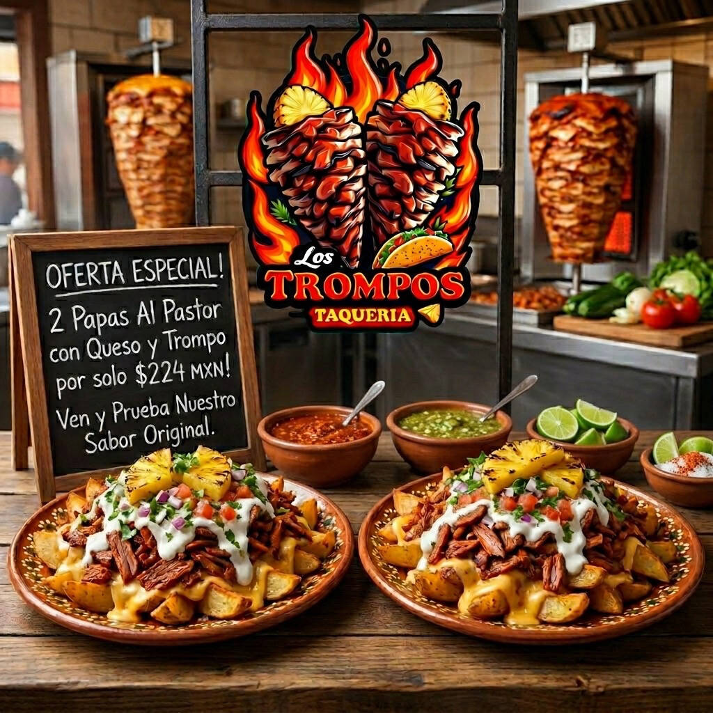 Papa Rellena de Pastor y Cheddar Una fusión irresistible que combina lo mejor del sabor urbano con la calidez de un plato horneado. La base es una papa de gran tamaño, cocida lentamente hasta que su interior adquiere una textura cremosa y suave. Esta papa se rellena con una generosa capa de queso cheddar fundido, que sirve de cama para 100 gramos de carne al pastor. La carne, marinada en su tradic