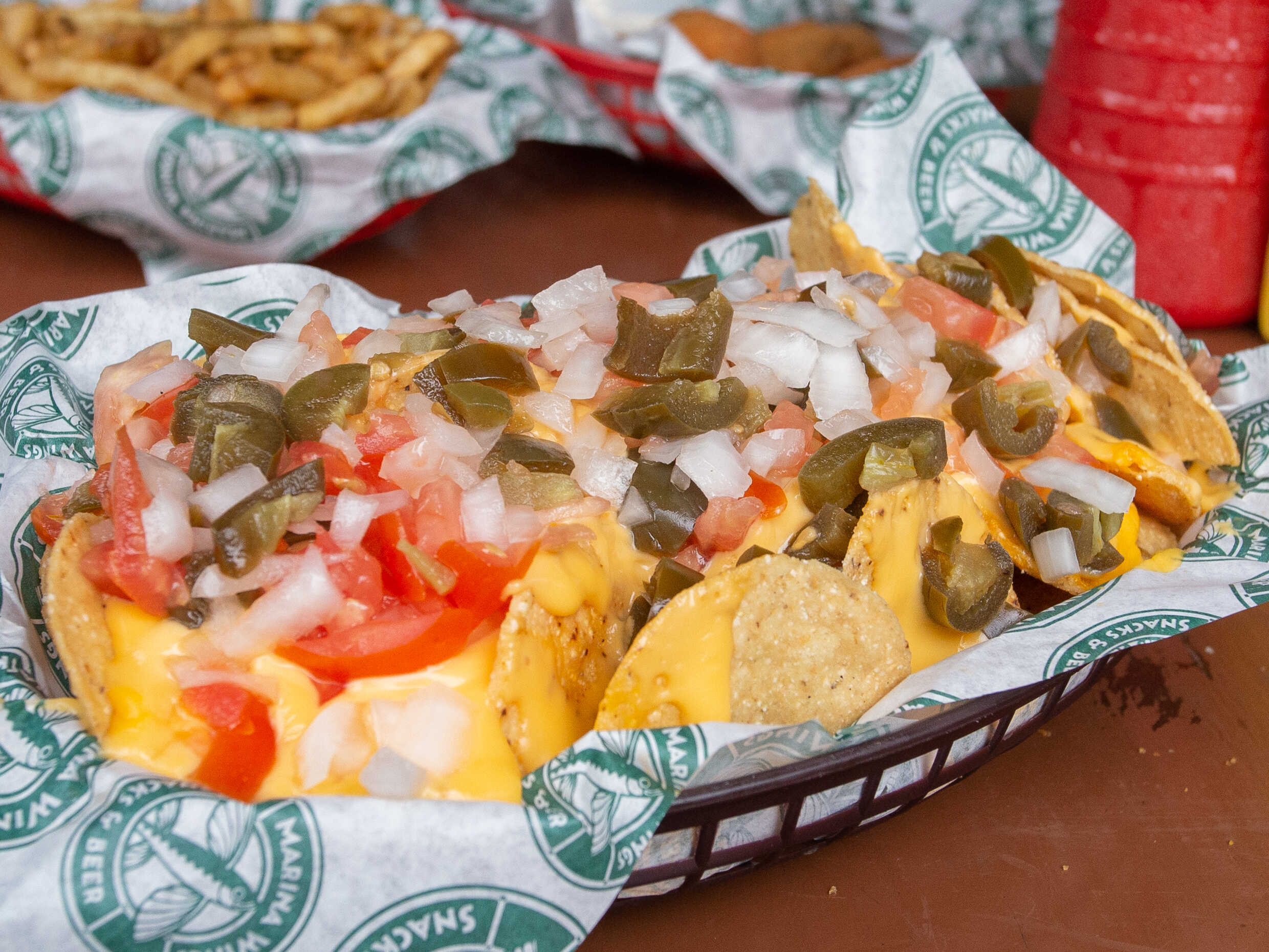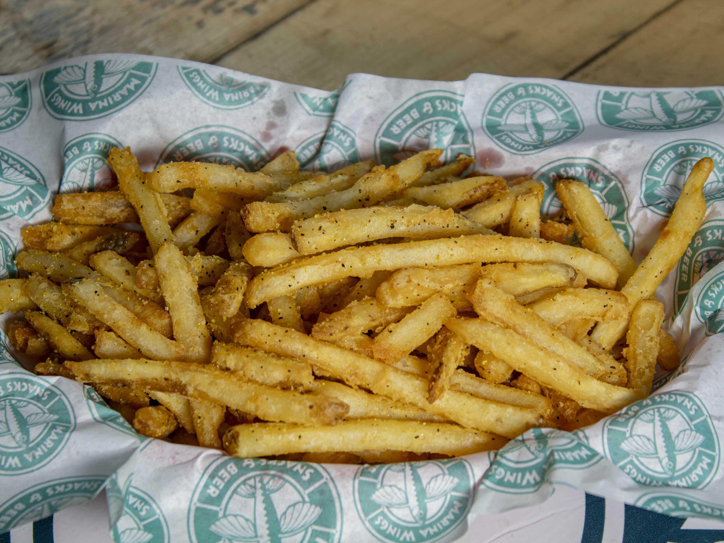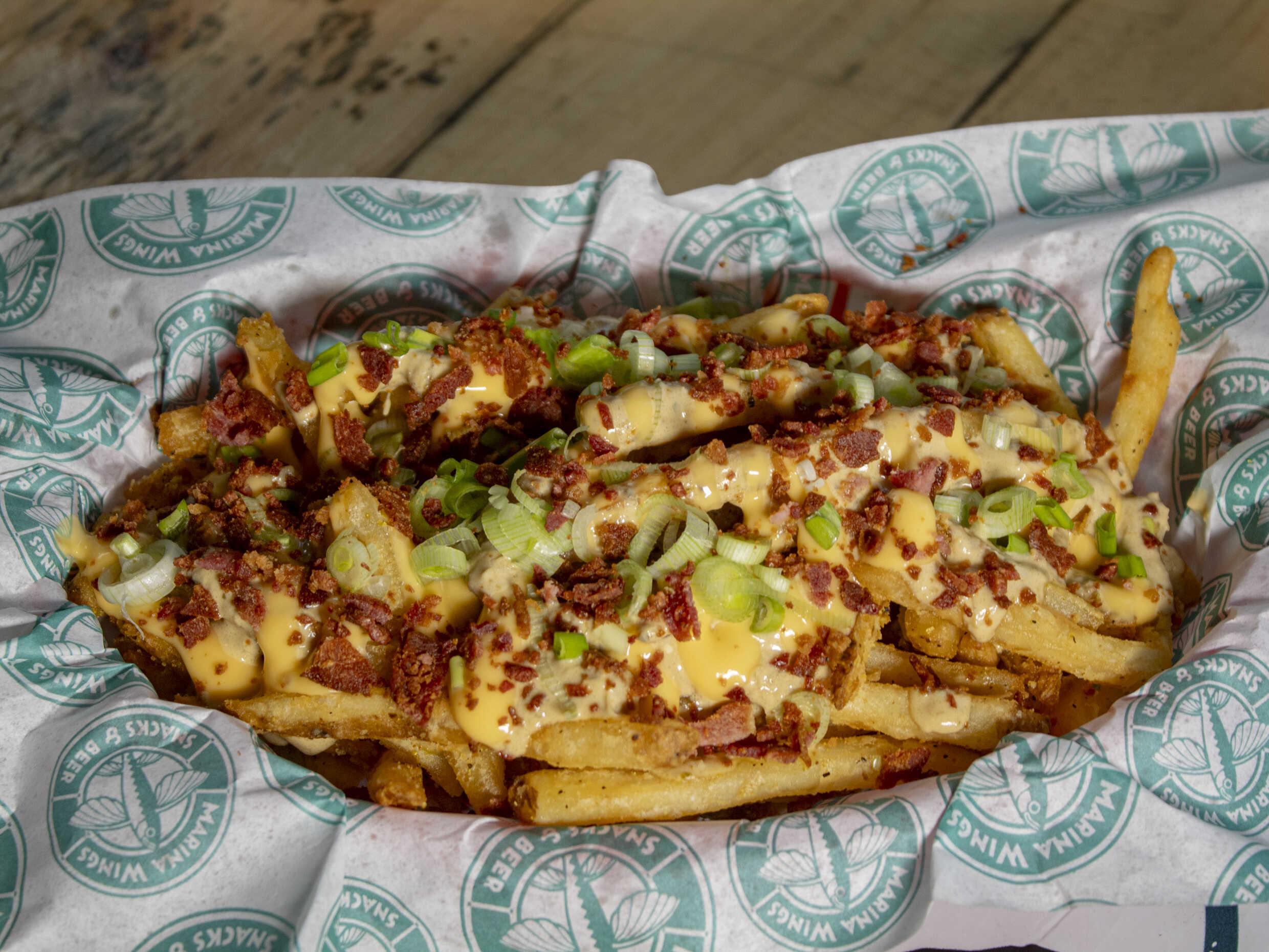 delicioso camaron a la parrilla y crujiente tocino con queso derretido bañados en salsa receta secreta, lechuga, jitomate y cebolla acompañada de papas a la francesa