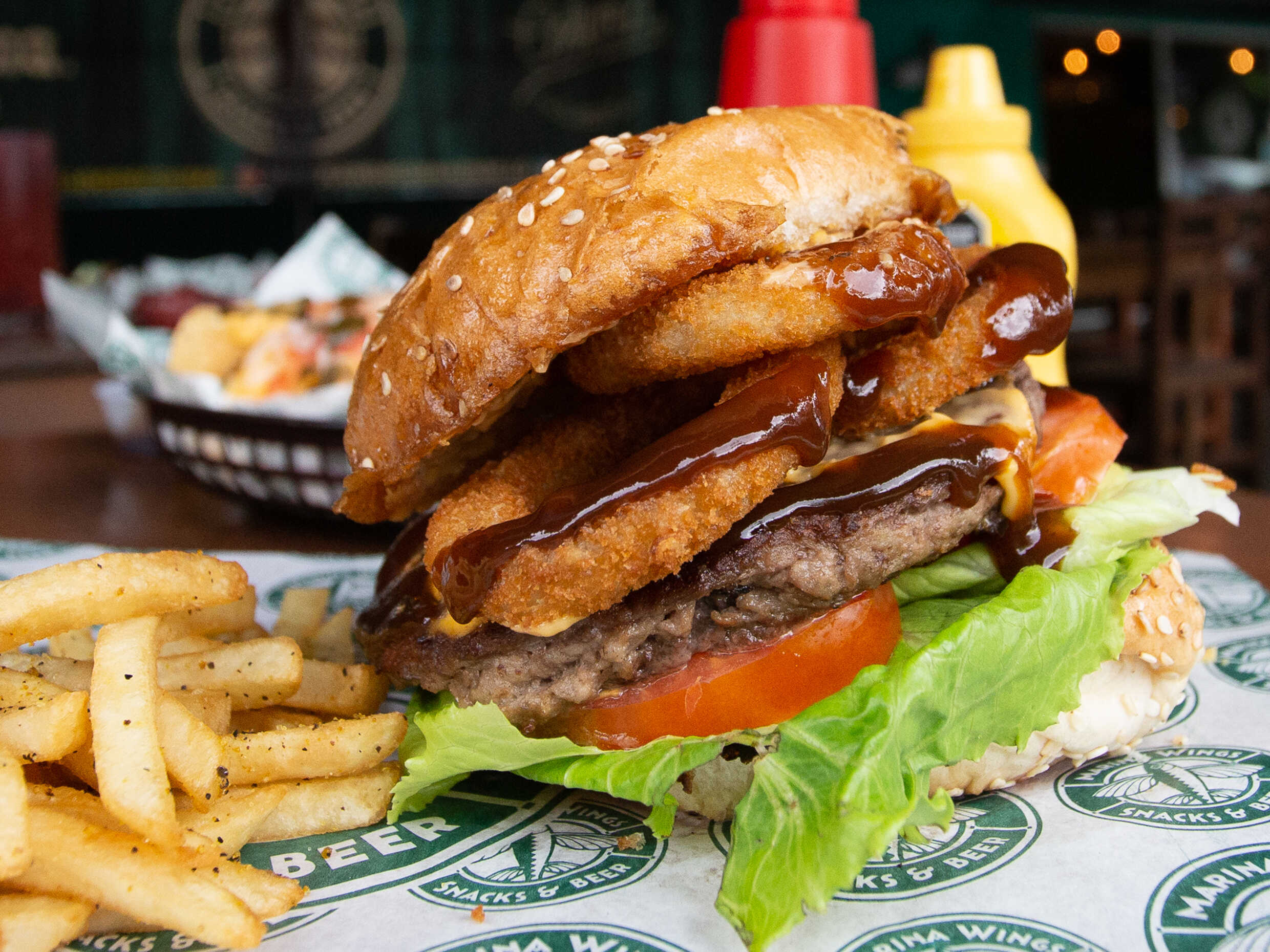 carne de res a la parrilla, queso derretido, crujiente aros de cebolla bañados en salsa bbq, lechuga, jitomate y cebolla acompañada de papas a la francesa