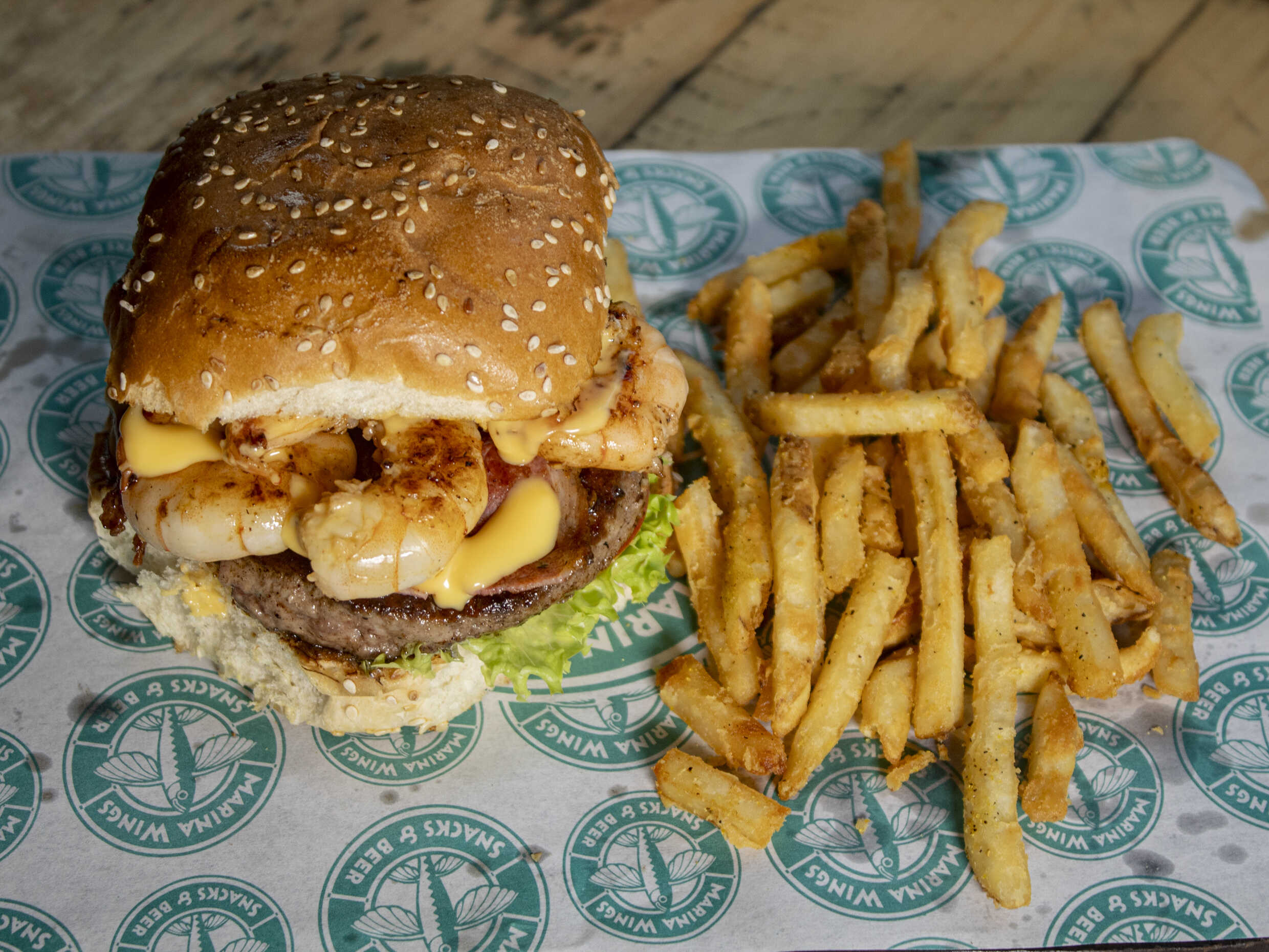 Carne de res a la parrilla y crujiente tocino acompañada con camarones al grill bañados en salsa receta secreta, lechuga, jitomate y cebolla, acompañados de papas a la francesa