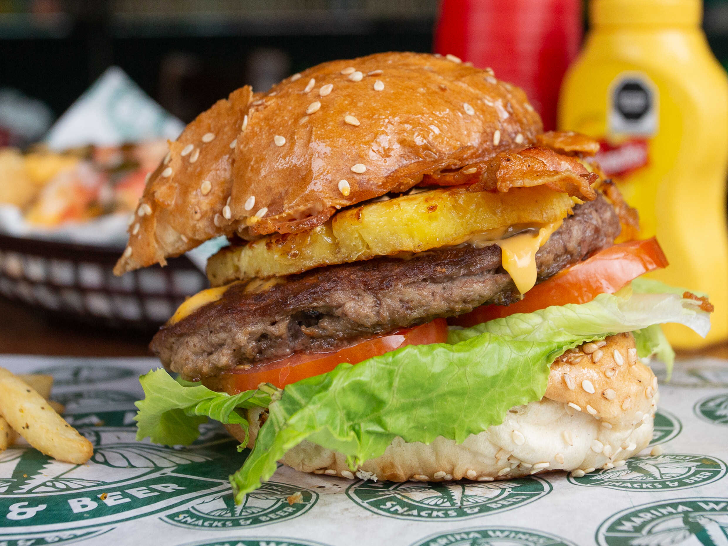 carne de res a la parrilla con crujiente tocino, queso derretido sobre una rebanada de piña a la parrilla, lechuga, jitomate y cebolla acompañada con papas a la francesa
