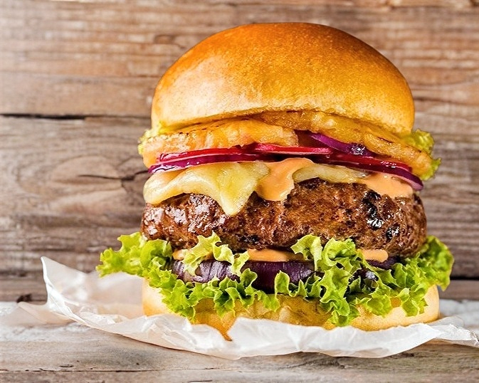 50 grs de pura carne de res, deliciosa piña a la parrilla , pan artesanal, lechuga italiana, jitomate, cebolla, y aderezo BBQ un poquito picante
