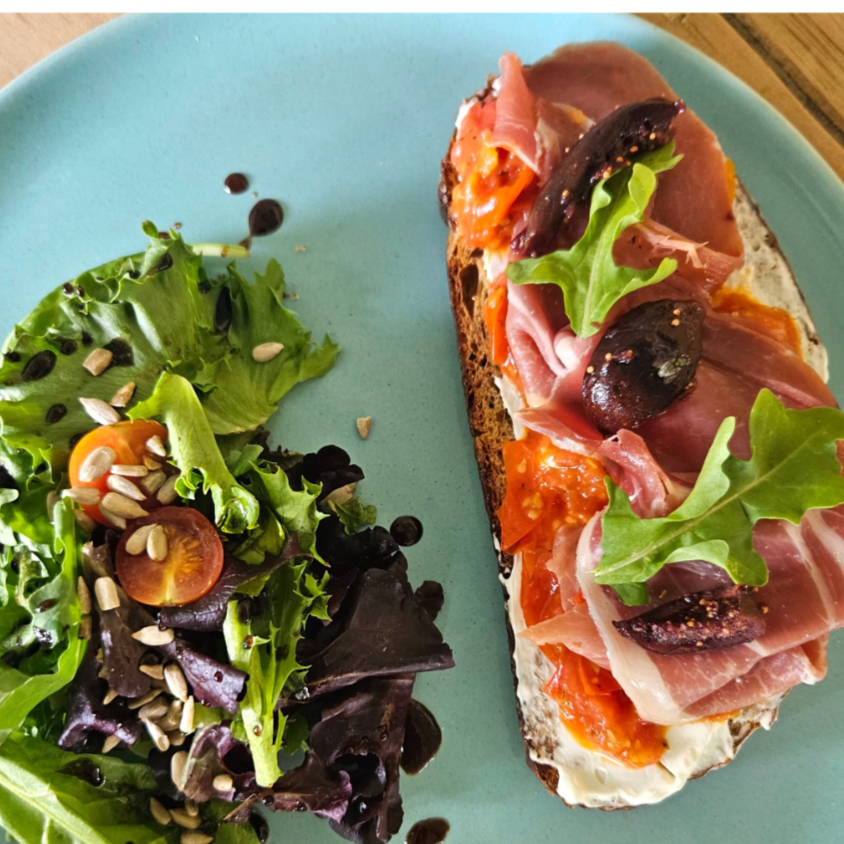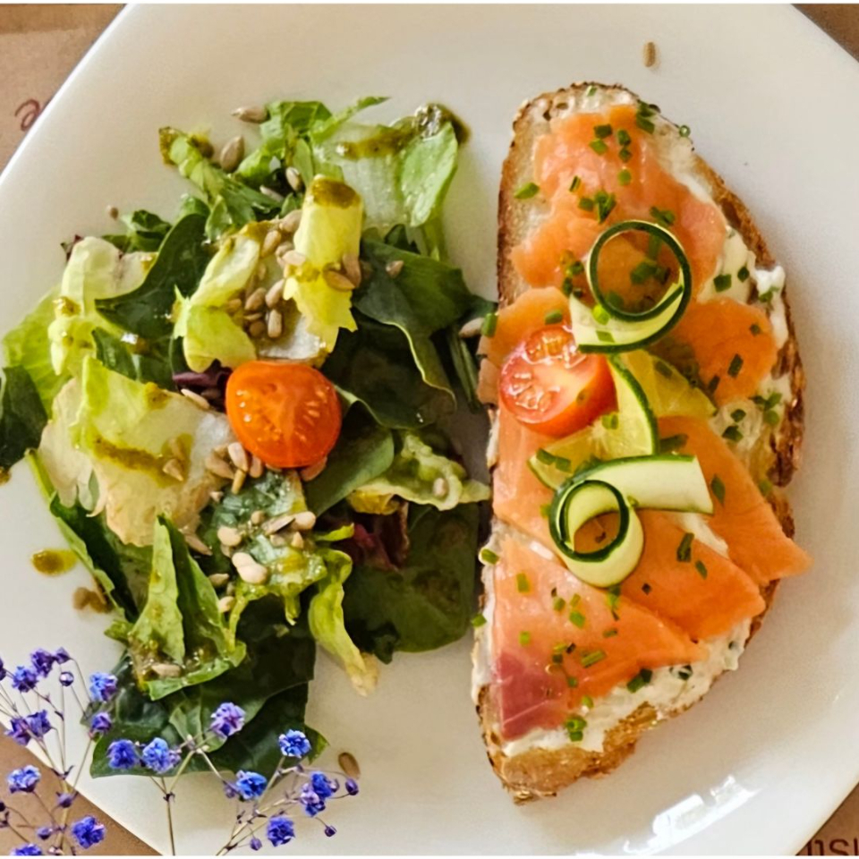 50 grs de salmón ahumado sobre cremosito cítrico, montado en una rebanada de hogaza artesanal. Se acompaña de ensalada.