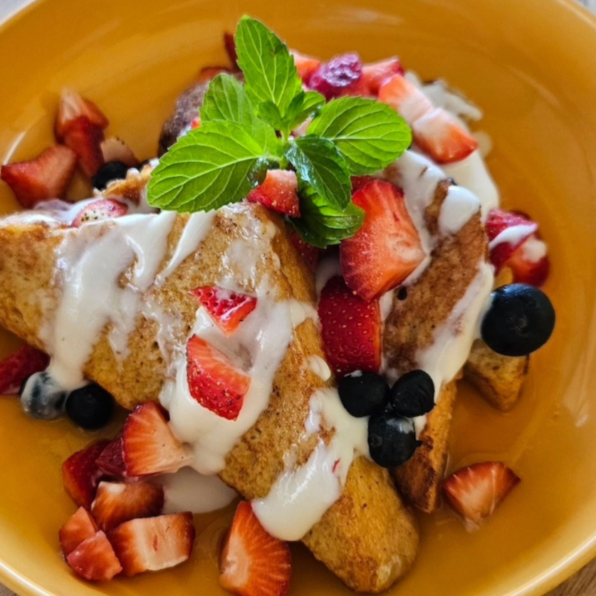 Pan brioche bañado en salsa suzette de naranja con crema de amaretto y frutos rojos. Un especial de la casa.