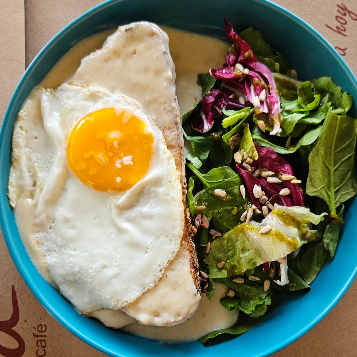 Emparedado de jamón y queso gratinado, con pan de masa madre. Bañado es salsa bechamel y coronado con 1 huevo estrellado. Se acompaña de ensalada.