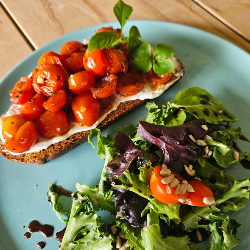 Cherrys salteados con hierbas finas y un toque de vinagre balsámico sobre pan de hogaza con cremosito de cabra. Decorado con un poco de reducción de balsámico. Se acompaña de ensalada.