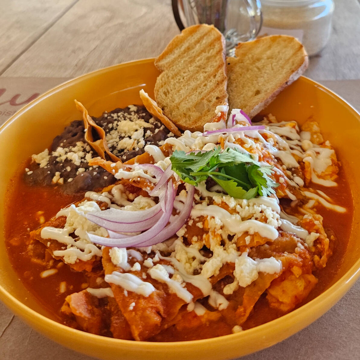 Totopo bañado en salsa roja con 1 huevo revuelto, acompañado de frijoles y bolillo. Llevan queso, crema y cebolla.