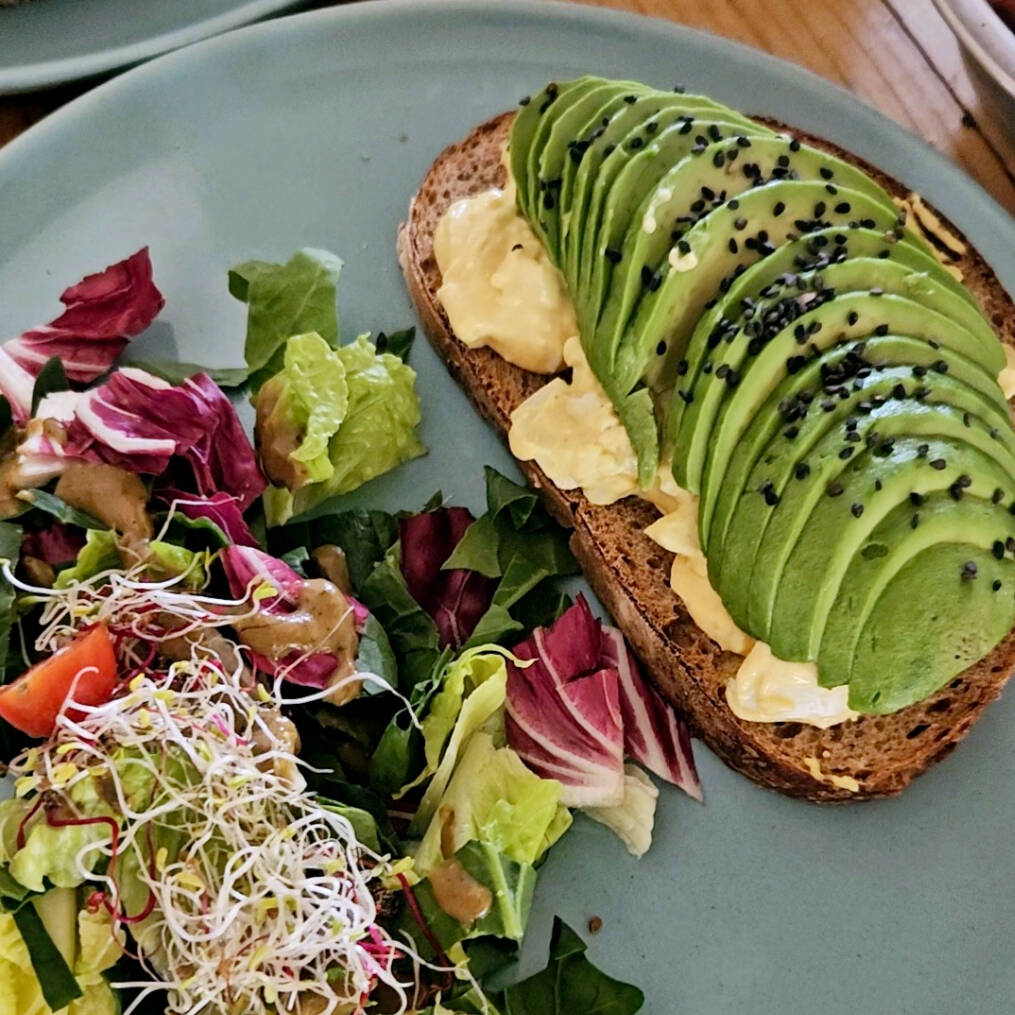 Ensalada de huevo cocido y medio aguacate sobre una rebanada de pan de masa madre. Acompañado de ensalada. El favorito de todos.