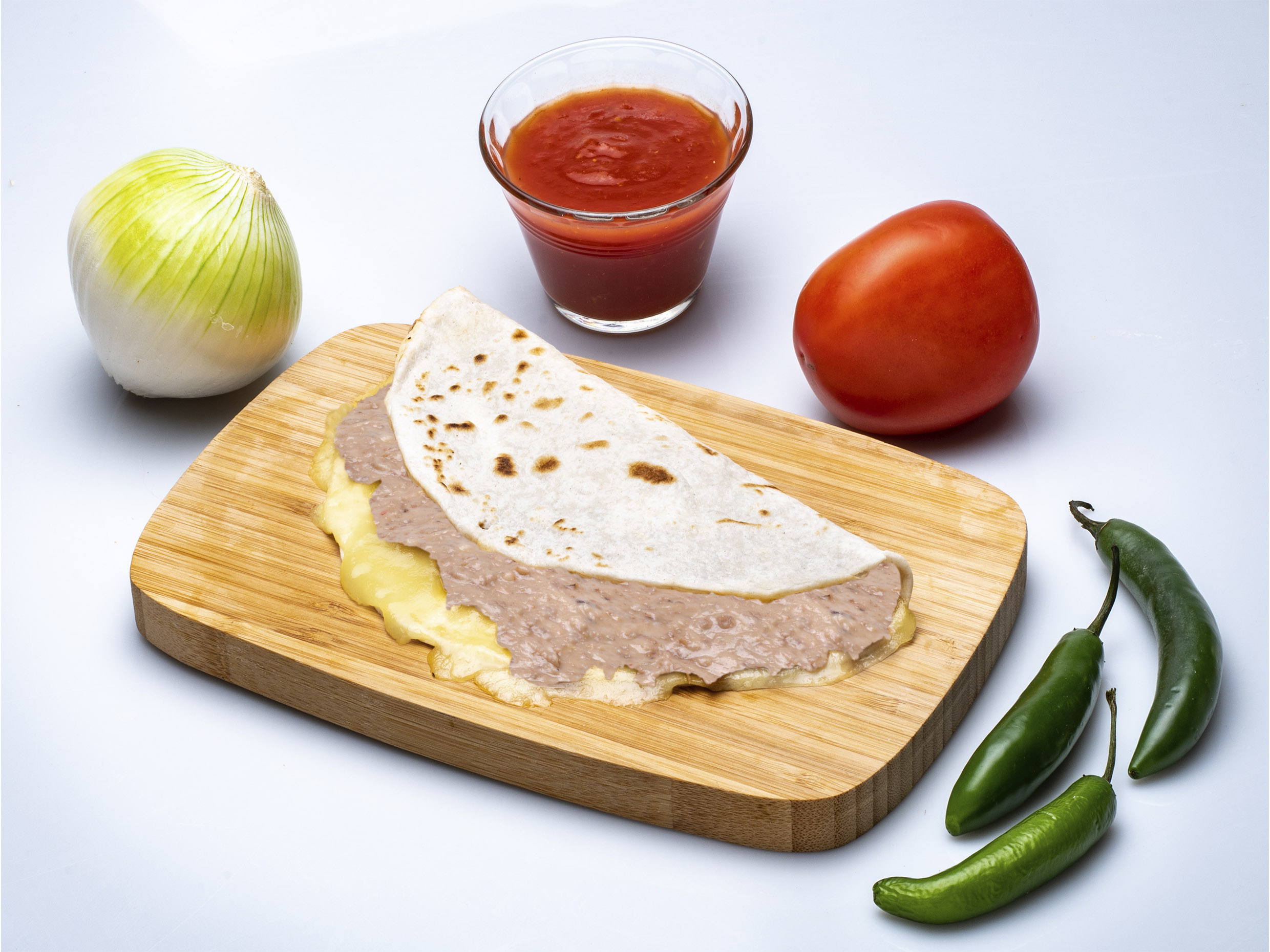Deliciosos frijoles refritos con nuestro toque especial, con una cama de queso fundido en una tortilla de harina de 20cm