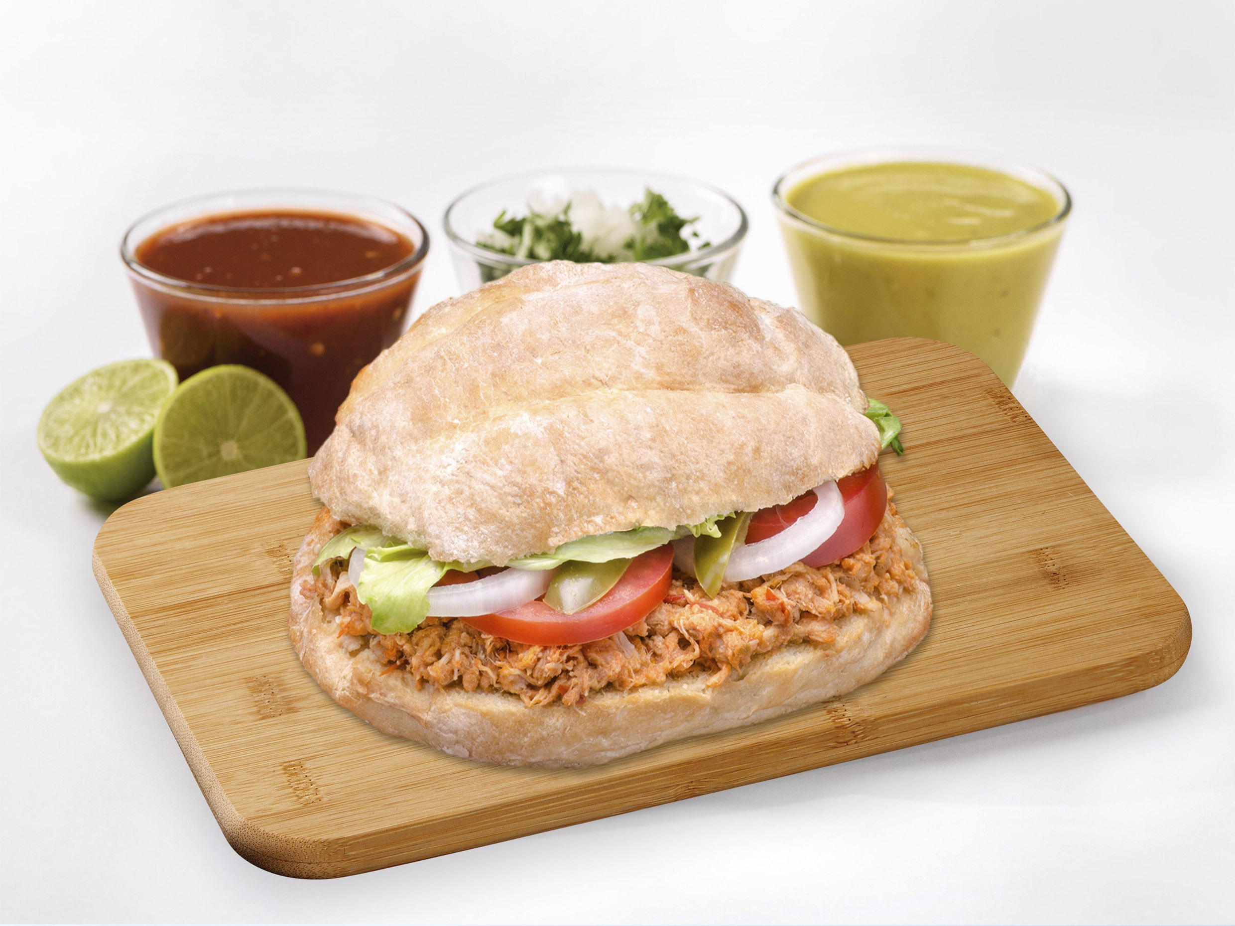 Torta con nuestra deliciosa Carne Deshebrada de Cerdo guisada en Achiote y Cebolla morada con Habanero.