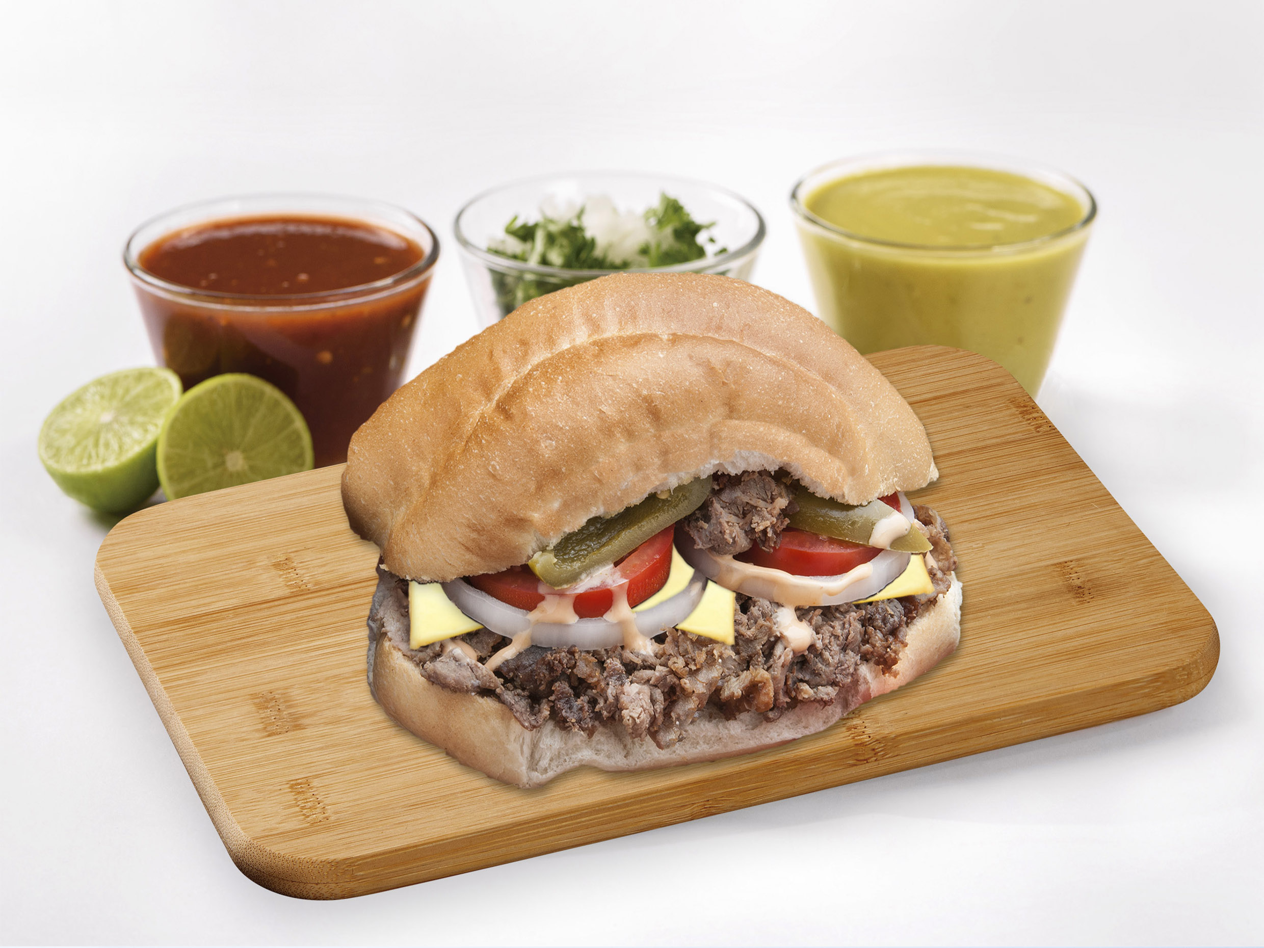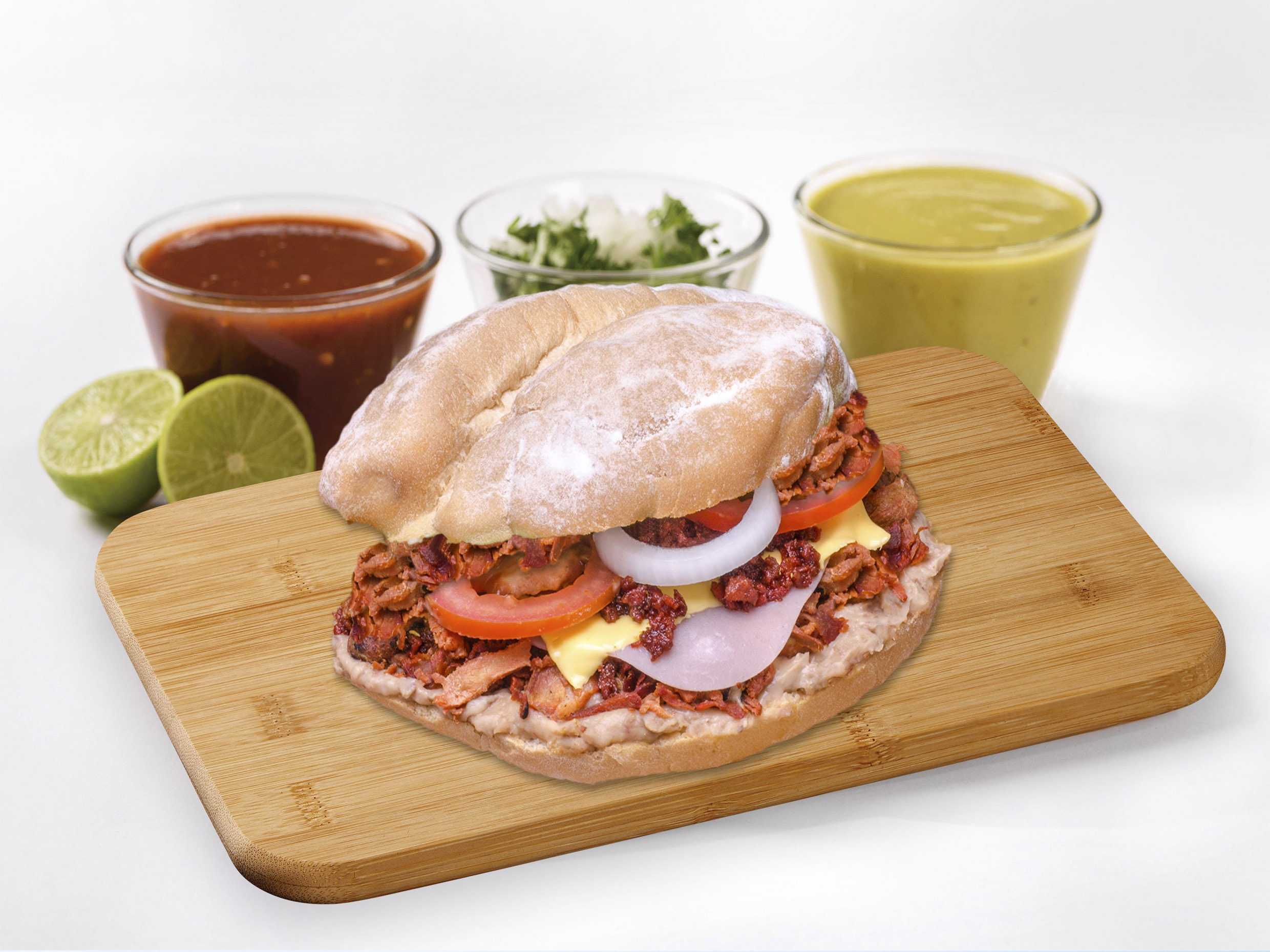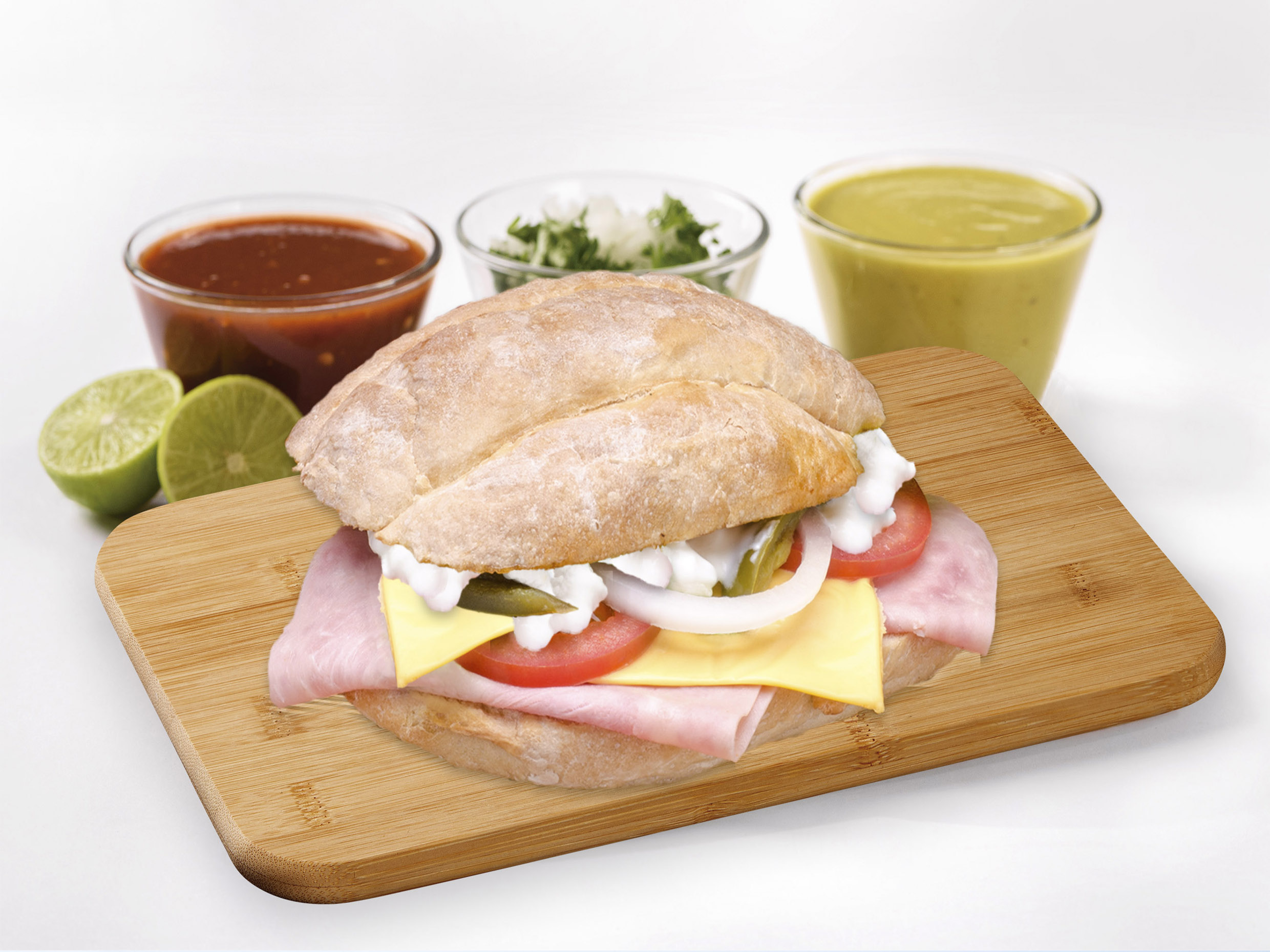 Suave pan blanco relleno de tu guiso favorito con lechuga, tomate, cebolla, mayonesa y chile jalapeño