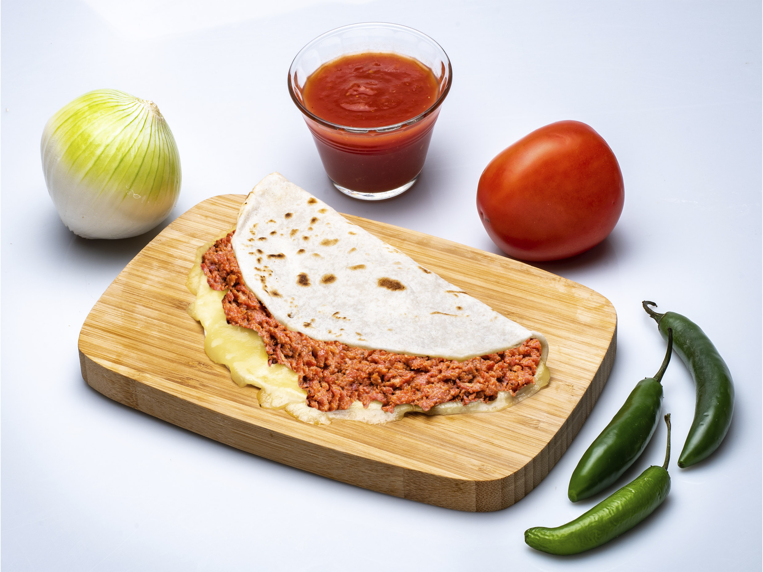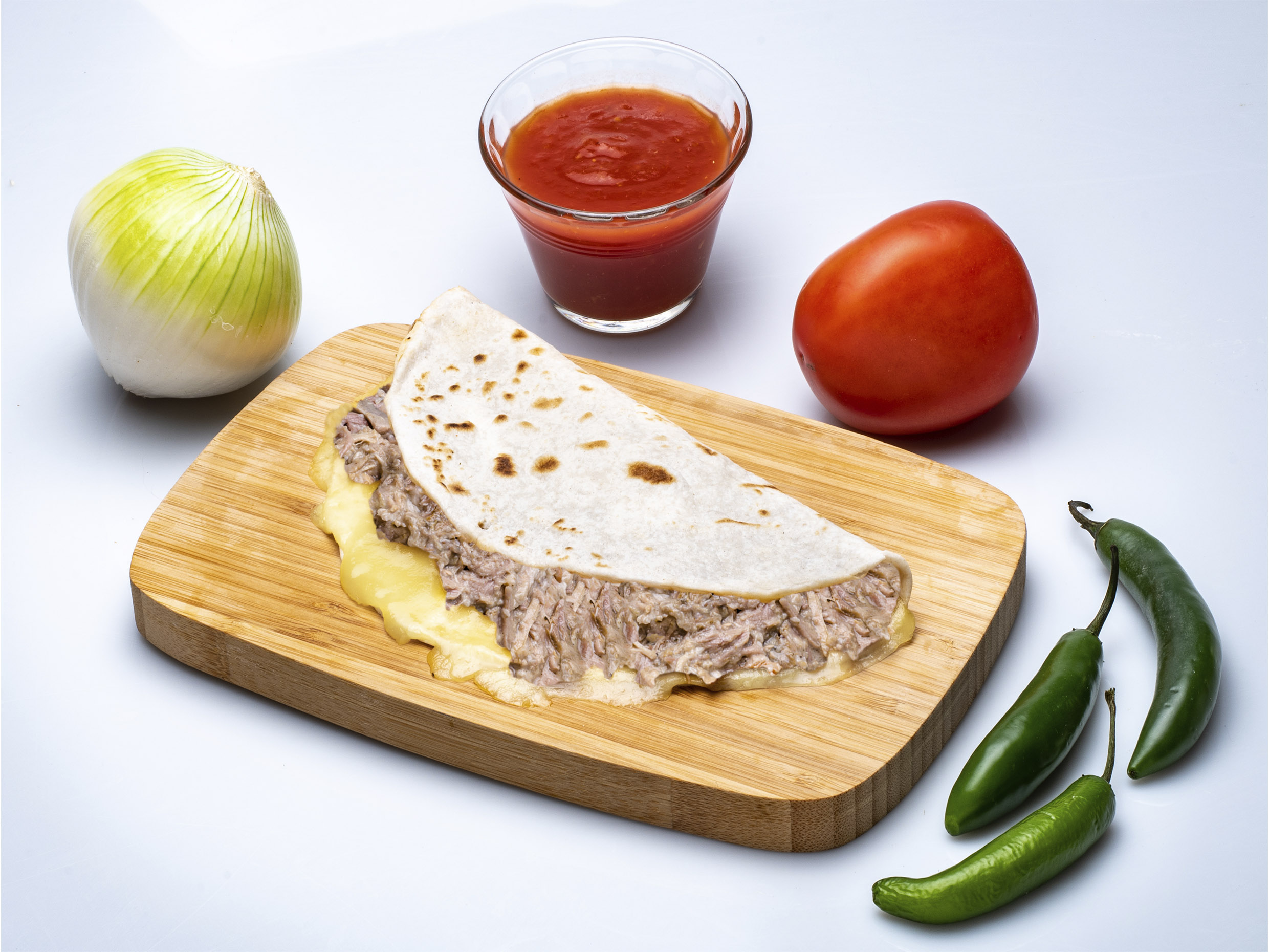 Deliciosa carne de cerdo cocinada lentamente con un sazón especial en una tortilla de harina con una base de queso fundido| 1 pz