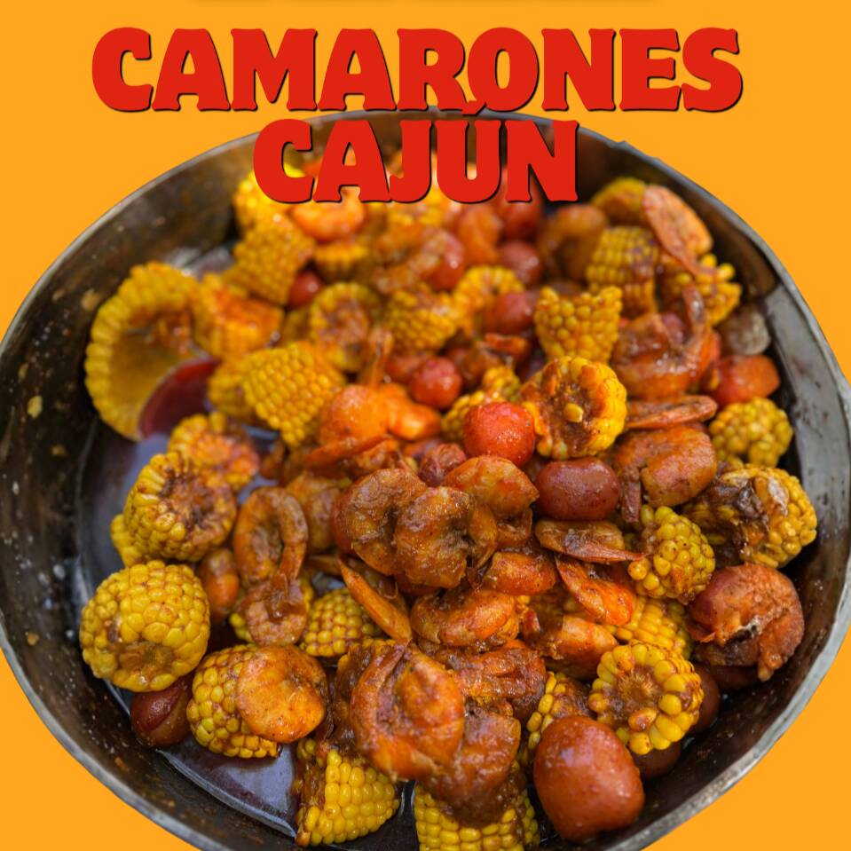 Jugosos camarones salteados en mantequilla con nuestra mezcla cajún, elote amarillo y papa cambray.