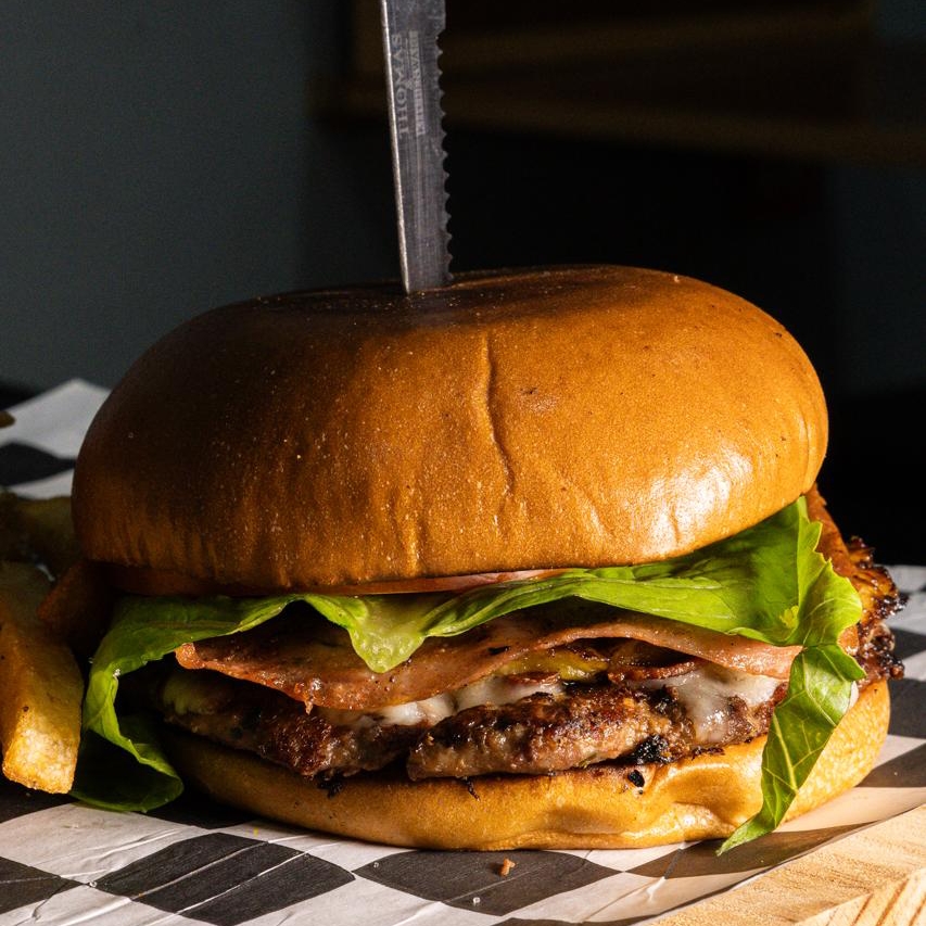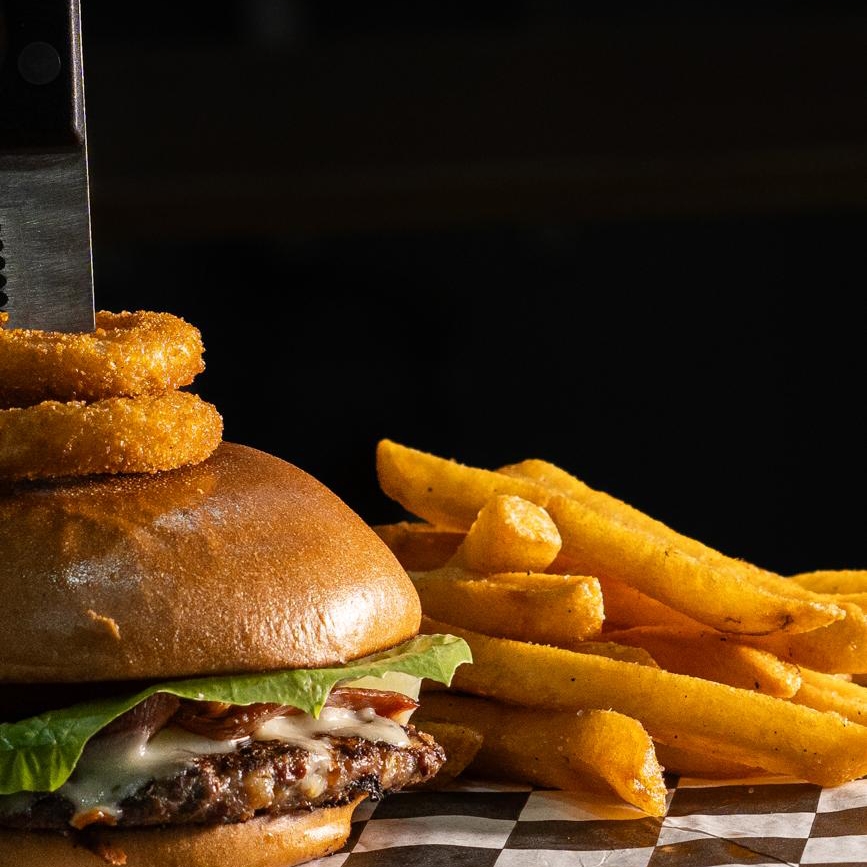 Carne de res, queso cheddar, tocino y dos aros de cebolla. Incluye papas a la francesa.