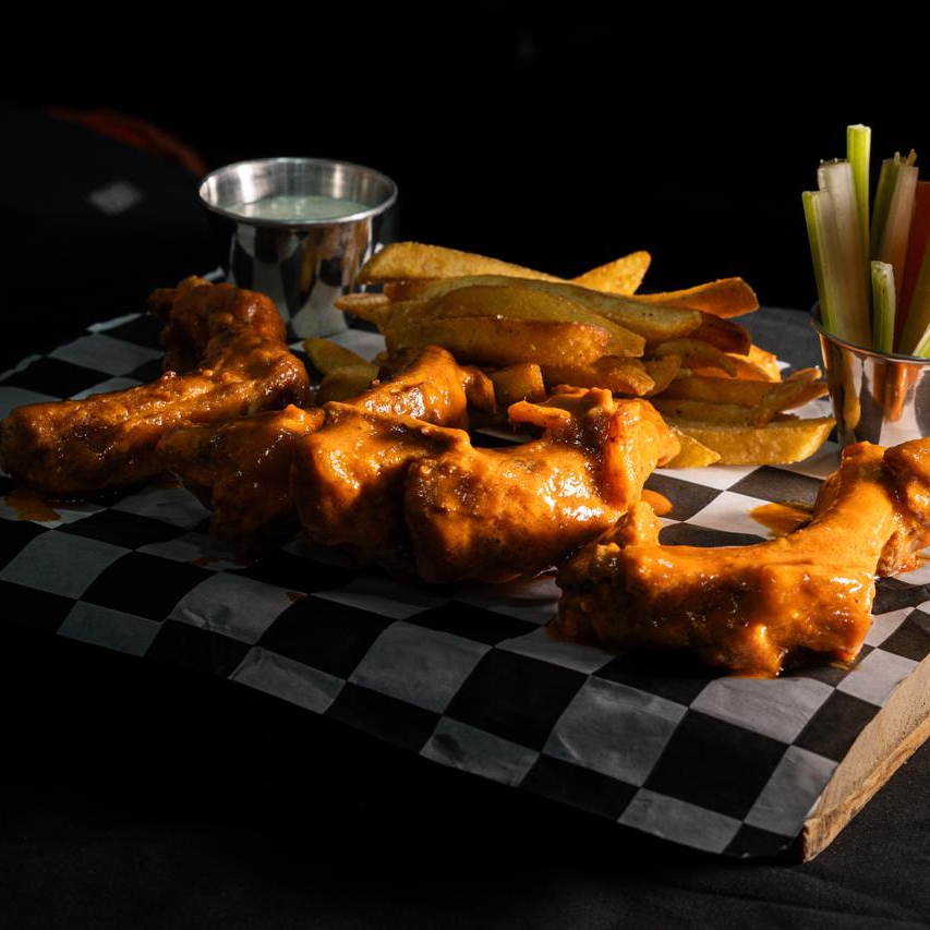 Papas a la francesa con queso amarillo, costillita en cuadritos, bañada con el sabor de tu elección y bañada con aderezo de la casa.