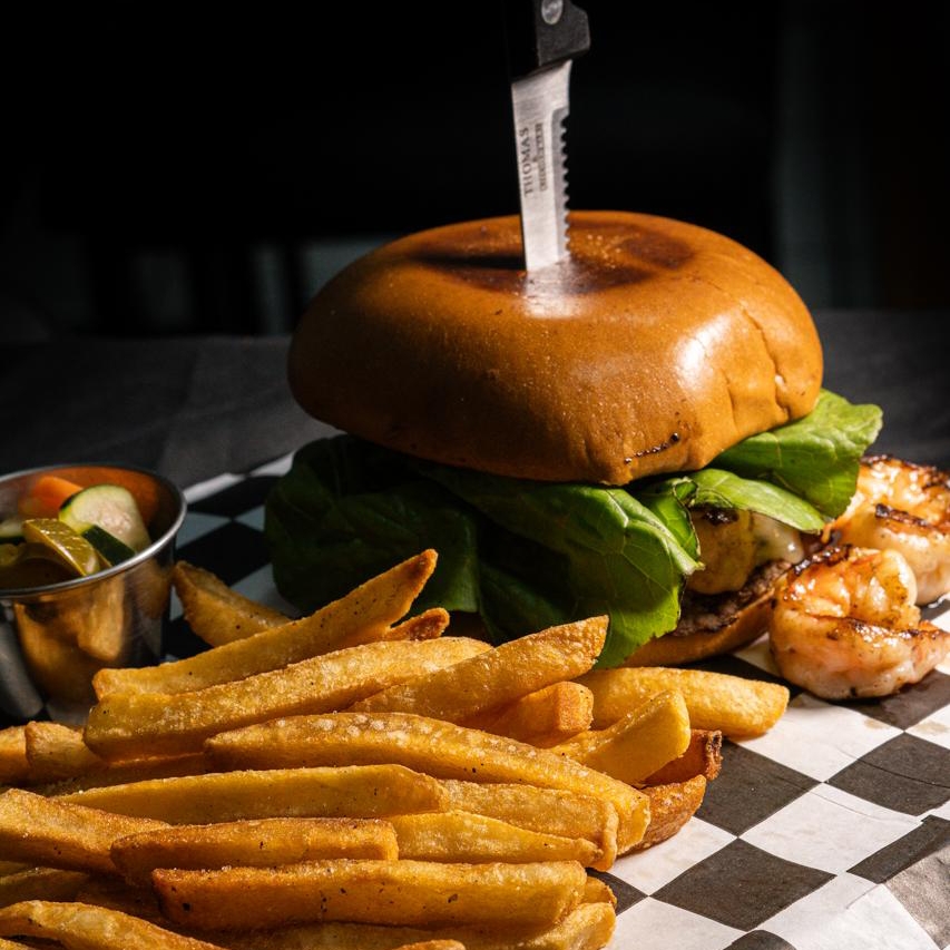 Carne de res, camarón deliciosamente sazonados, queso chédar. Incluye papas a la francesa.