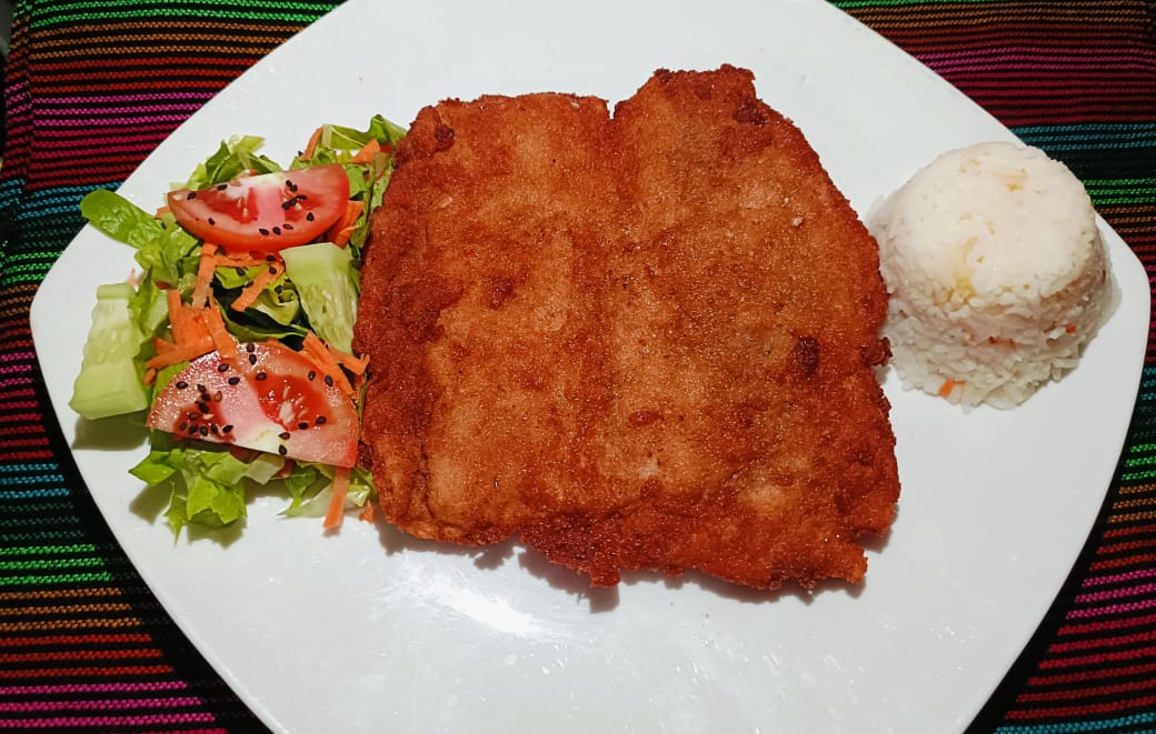 Pescado empanizado con harina de trigo y huevo frito en aceite.