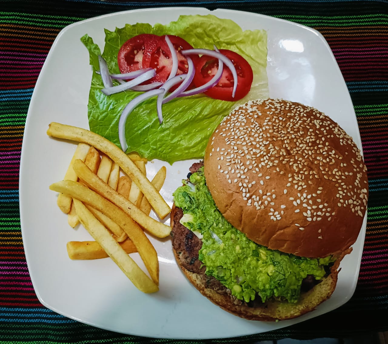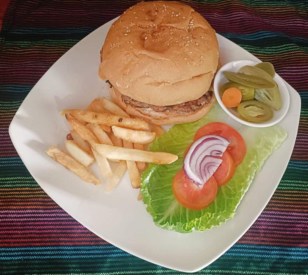 Hamburguesa con carne de res, guacamole y queso manchego.
