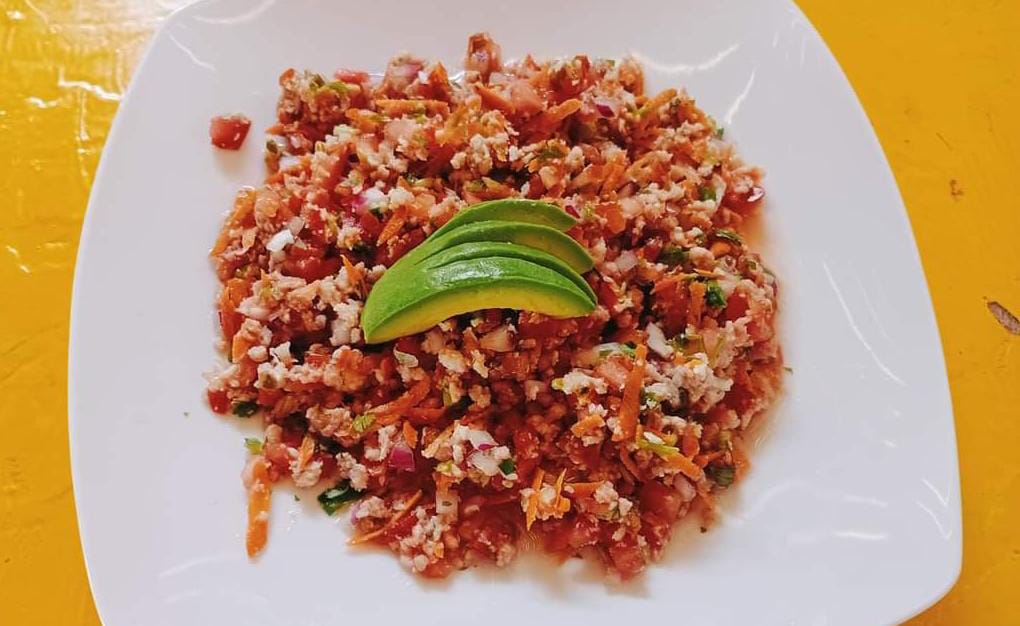 carne molida de pescado con ensalada de jitomate, cebolla, cilantro, limon y pepino.