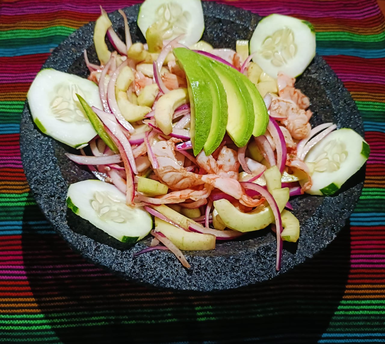 Ceviche con ensalada de jitomate, cebolla, cilantro, limon y pepino.