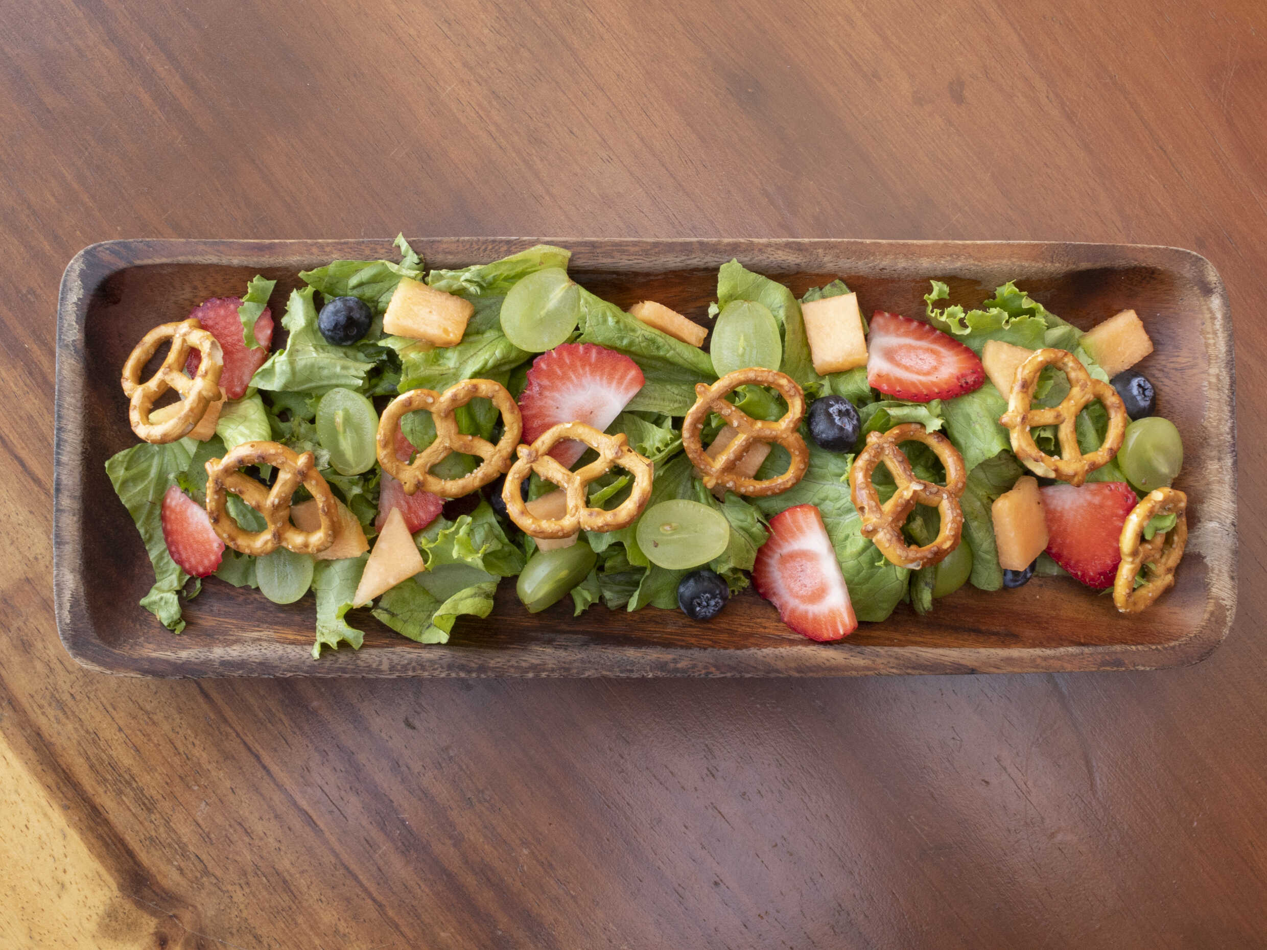 Base de lechuga acompañada con fresa, berries,uvas,melón, como crocante pretzel bañados en vinagreta de miel.