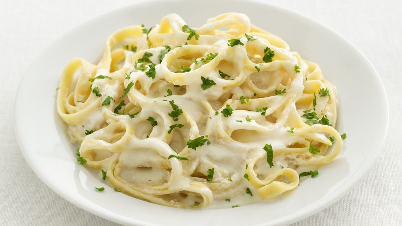 Pasta fresca en salsa cremosa, jamon y camarones salteados con cebolla y ajo espolvoreada con queso parmesano