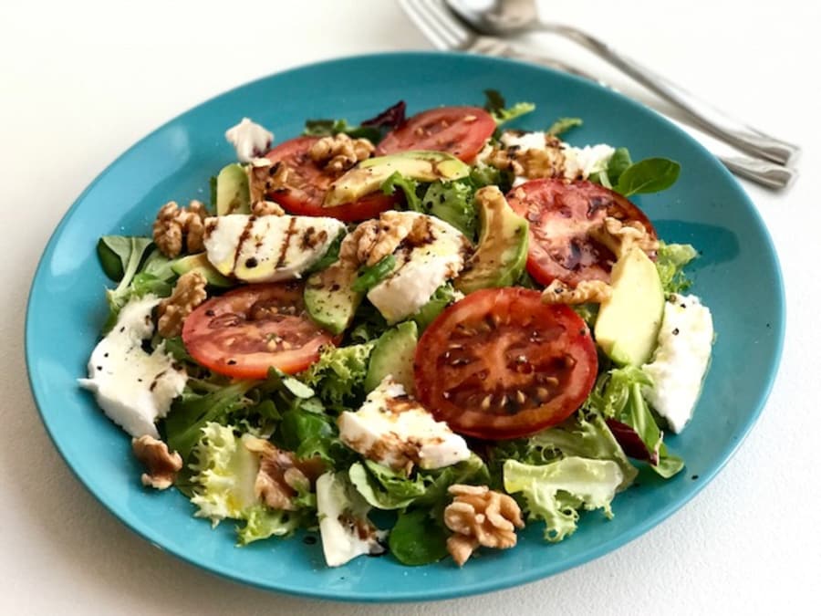 Base de lechuga servida con jitomate, cebolla, morrón, sal, pimienta y bañada en vinagreta de balsámico
