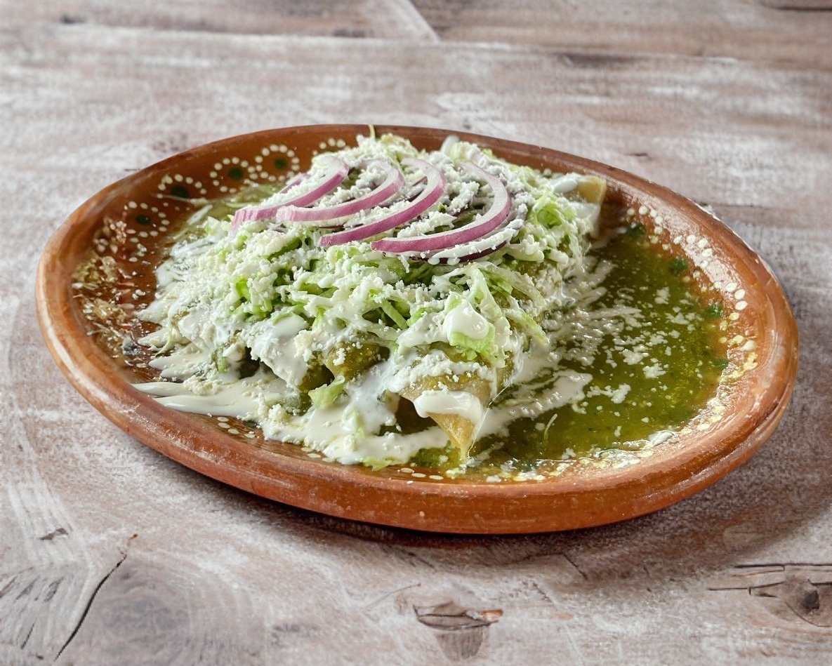 Cuatro Tortillas de maíz rellenas de pollo deshebrado, bañadas en salsa verde de la casa hecha con tomatillo, ajo y cilantro. Se sirven calientes, con crema, queso semiseco espolvoreado y cebolla morada.