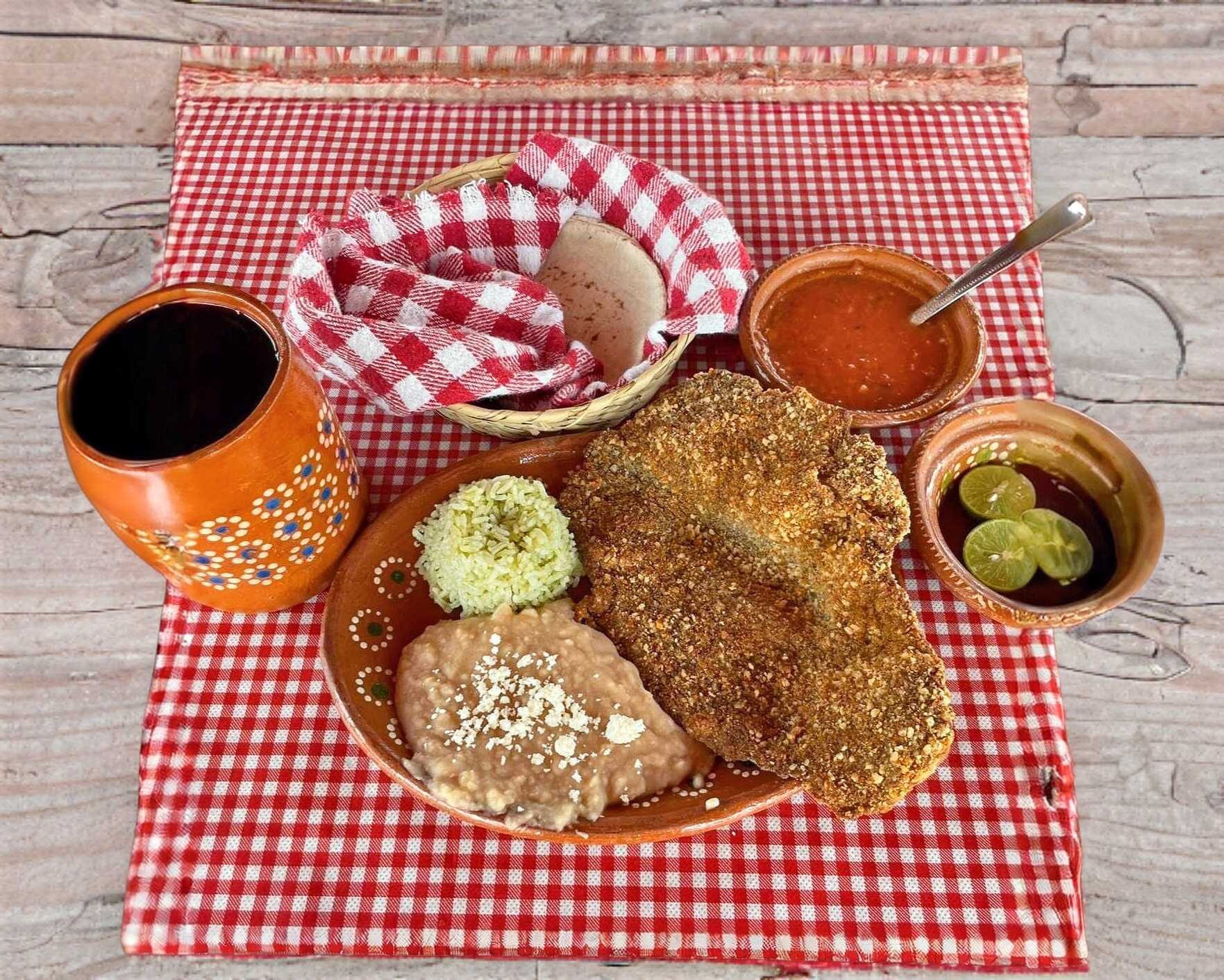 Milanesa de res empanizada, dorada y crujiente. Servida con frijoles refritos, arroz, tortillas, limón y salsa de la casa.