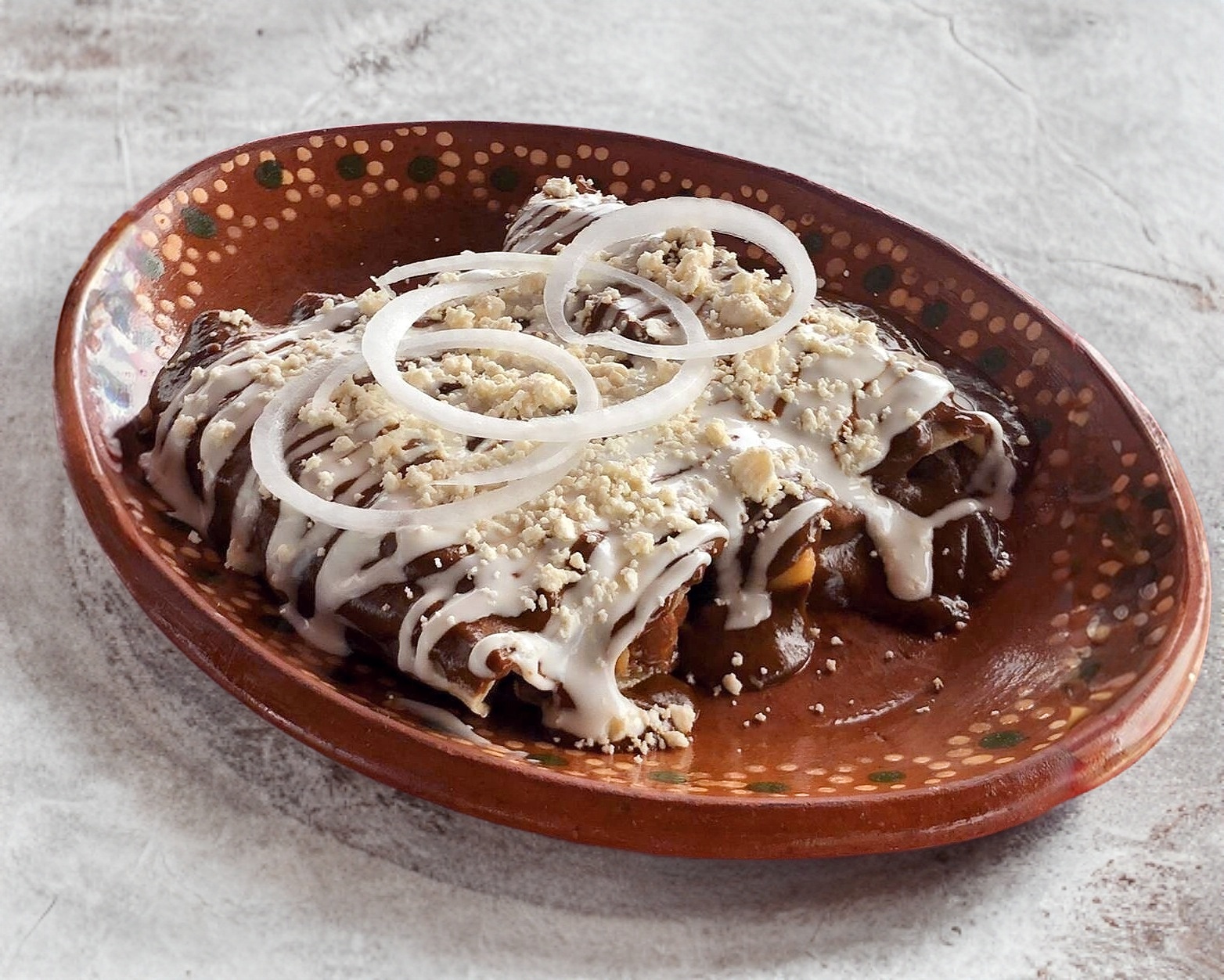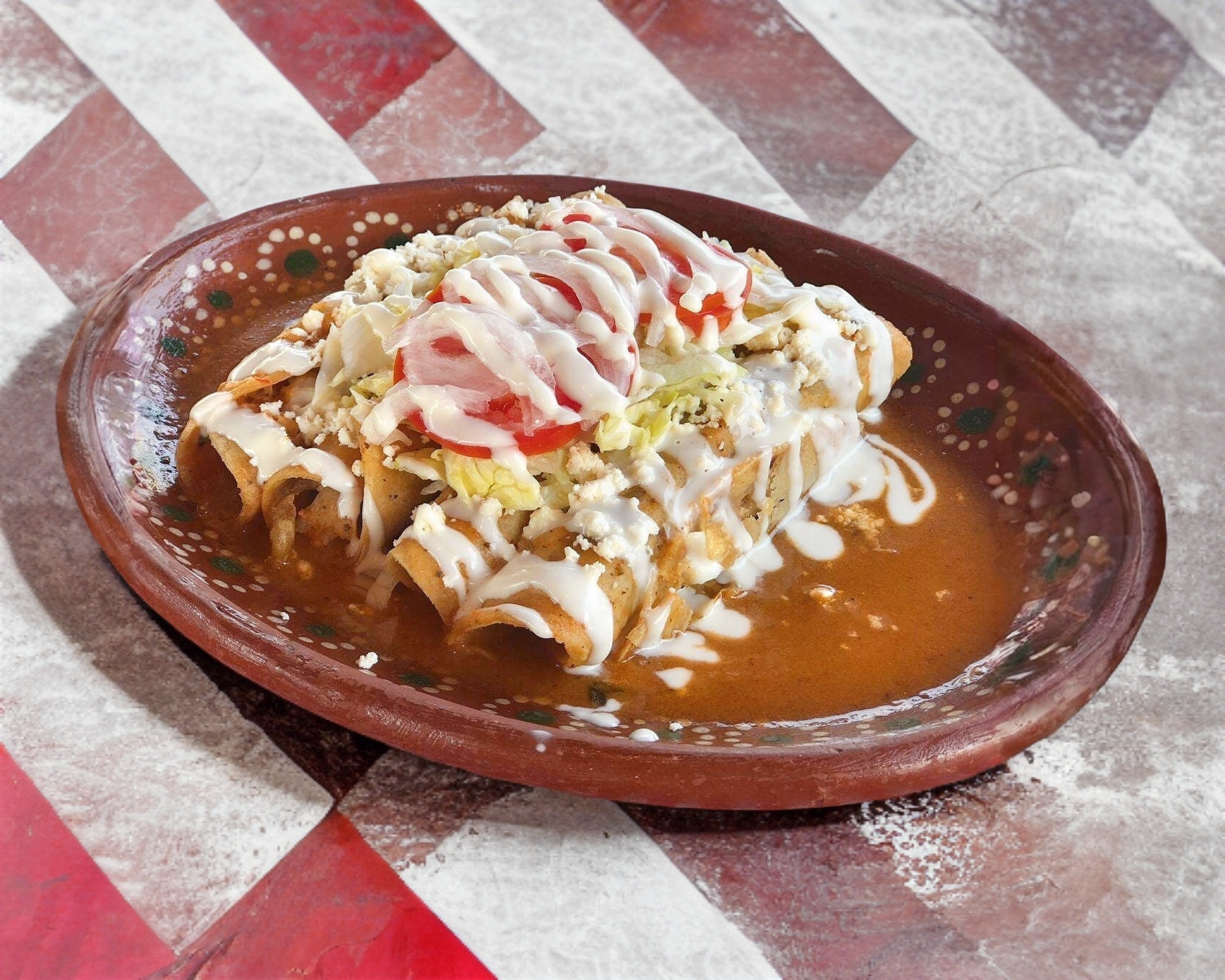 Cuatro Tortillas de maíz rellenas de pollo deshebrado y bañadas en mole de la casa, espeso y lleno de sabor. Se terminan con crema, queso semiseco espolvoreado y cebolla morada.