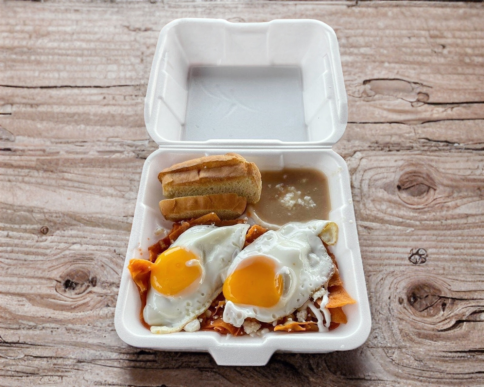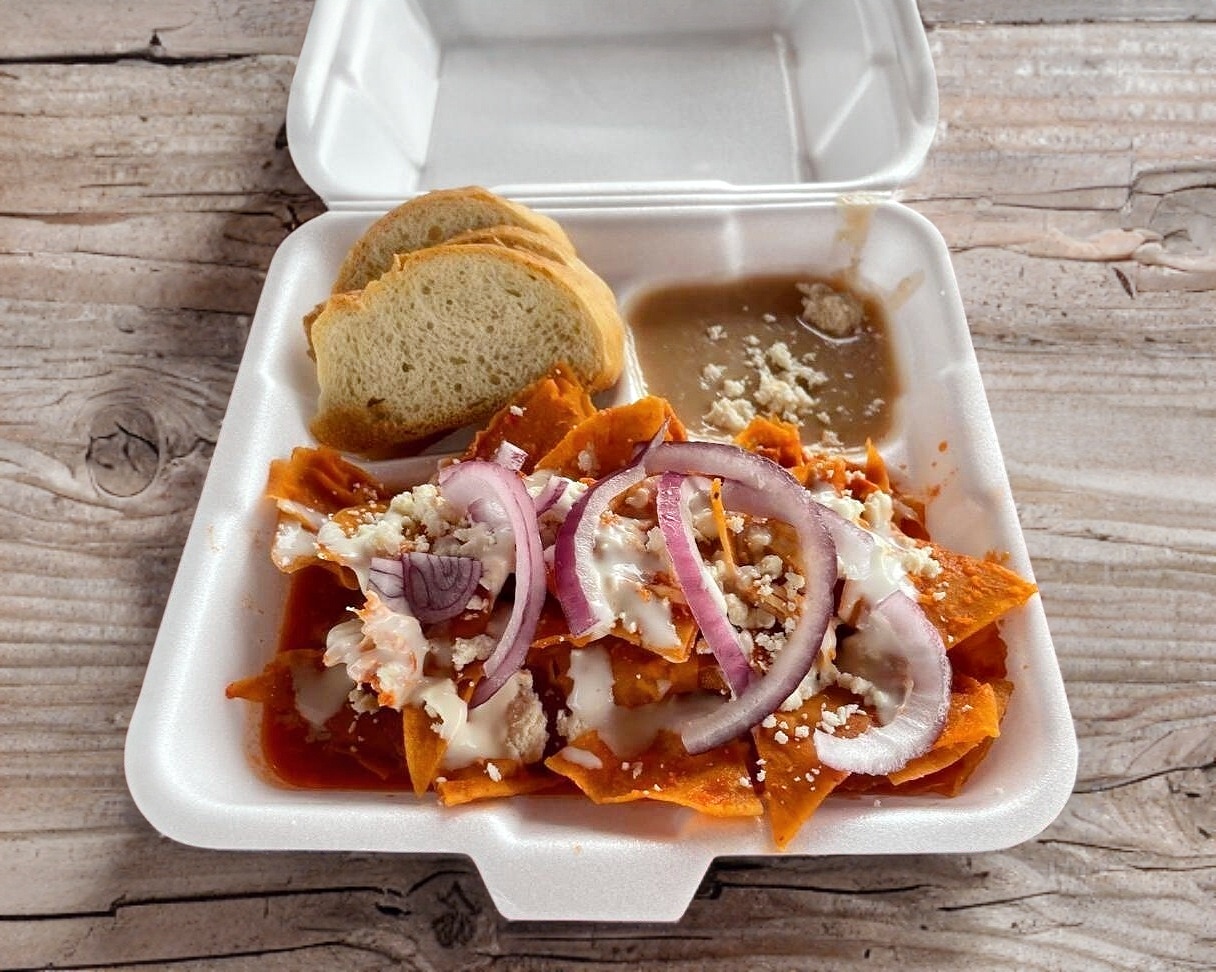 Totopos crujientes bañados en salsa roja de la casa, con pollo deshebrado. Se terminan con crema, queso semiseco espolvoreado y cebolla morada. Todo acompañado con frijoles refritos y bolillo tostado.