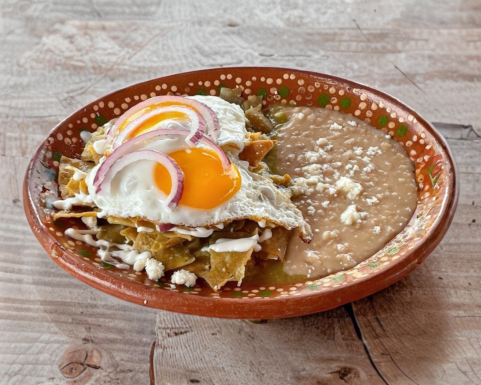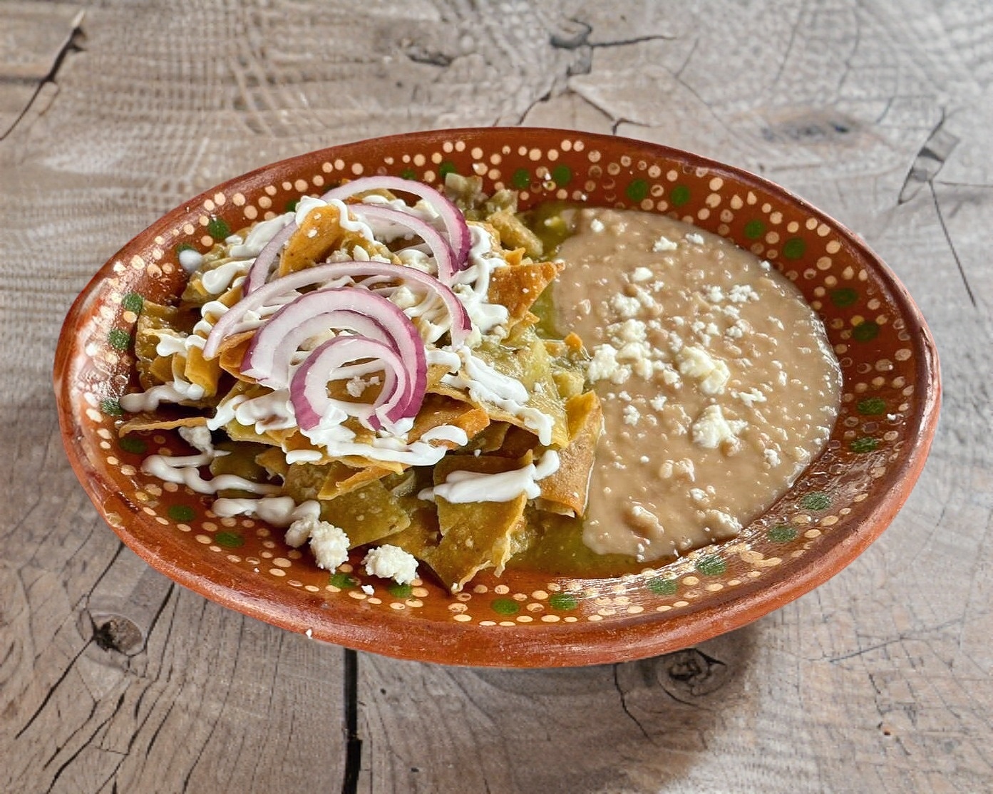 Totopos crujientes bañados en salsa verde de la casa, con pollo deshebrado. Se terminan con crema, queso semiseco espolvoreado y cebolla morada. Acompañados con frijoles refritos y bolillo tostado