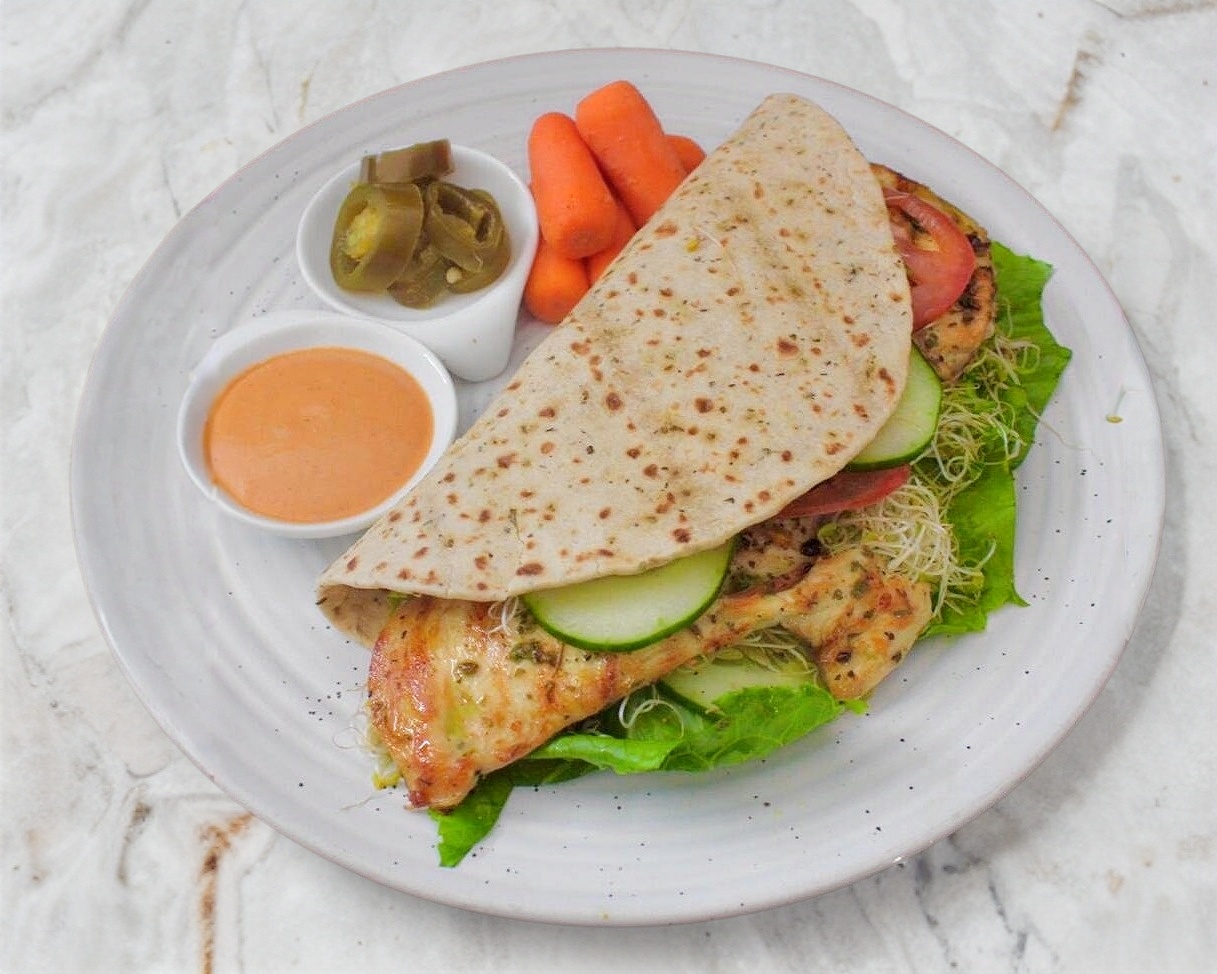 Pa oro wheat, pechuga de pollo sazonada a la plancha (lechuga, jitomate, pepino, aguacate, germinado) con zanahoria baby