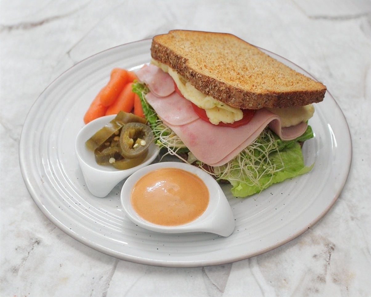 PAN ESTILO NY CON JAMON Y PANELA (LECHUGA, GERMINADO, JITMOMATE, PEPINO Y AGUACATE)