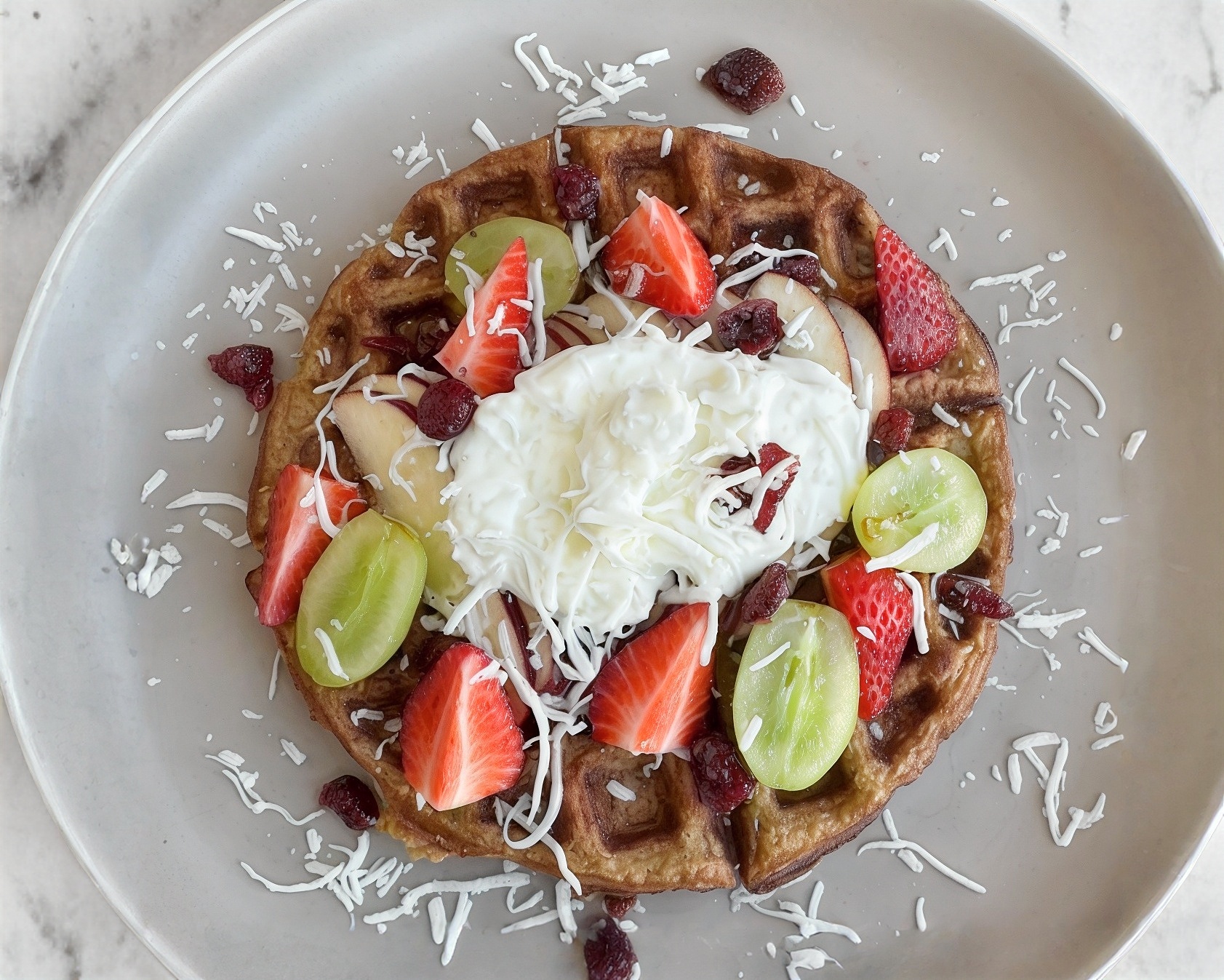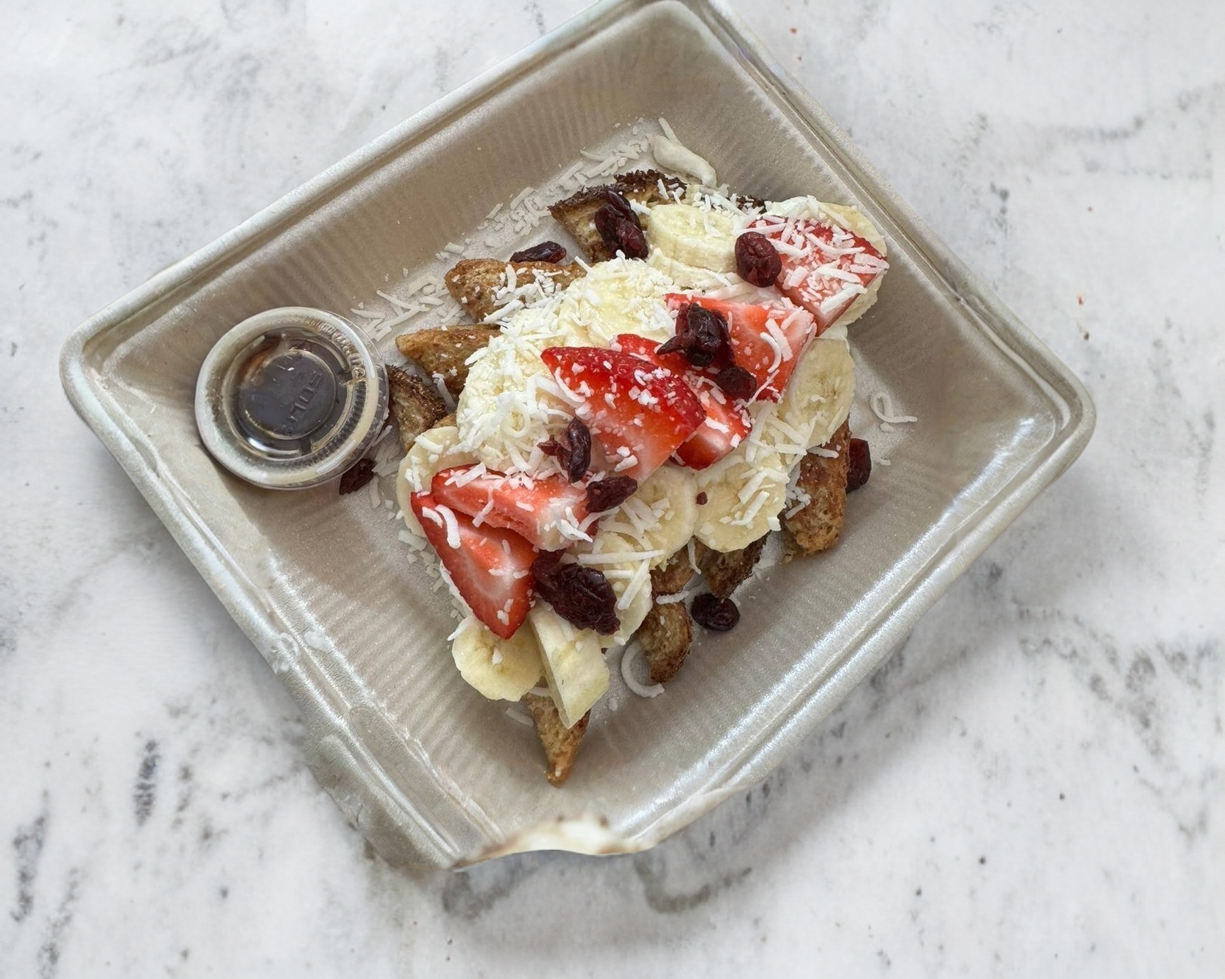 Pan frances dorado con poquita mantequilla, endulzado con stevia y terminado con fruta fresca y yogurt griego