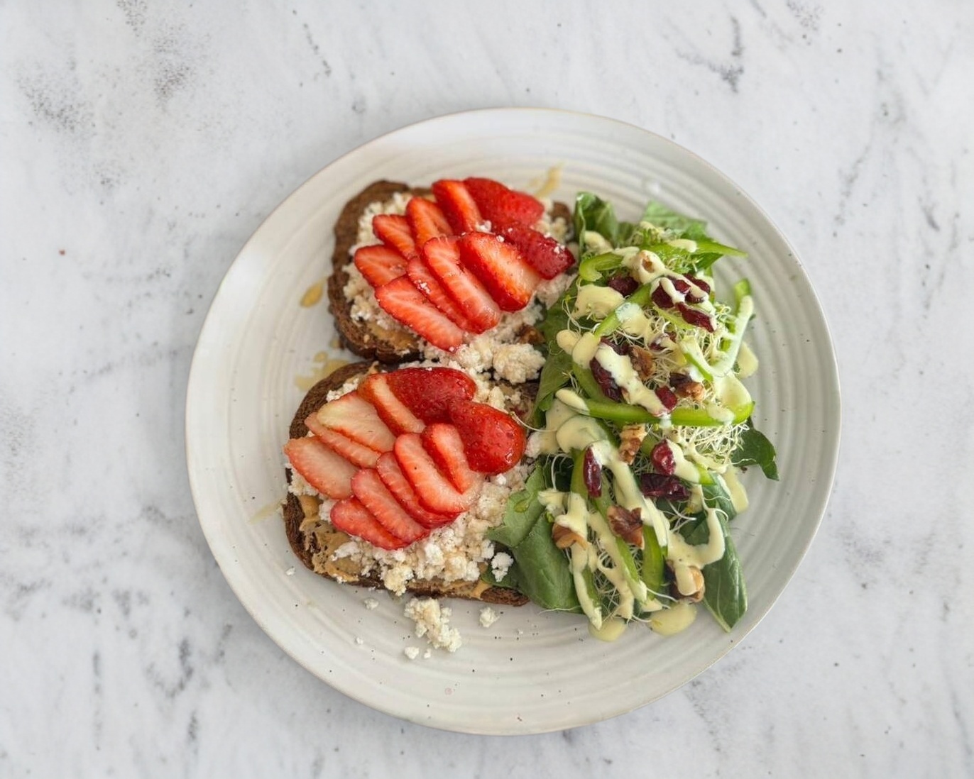 2 panes tostados con crema de cacahuate, requeson, fresas fileteadas & un toque de miel. Acompañado de ensalada