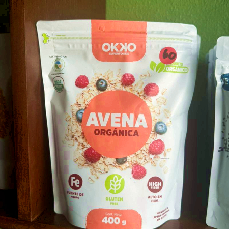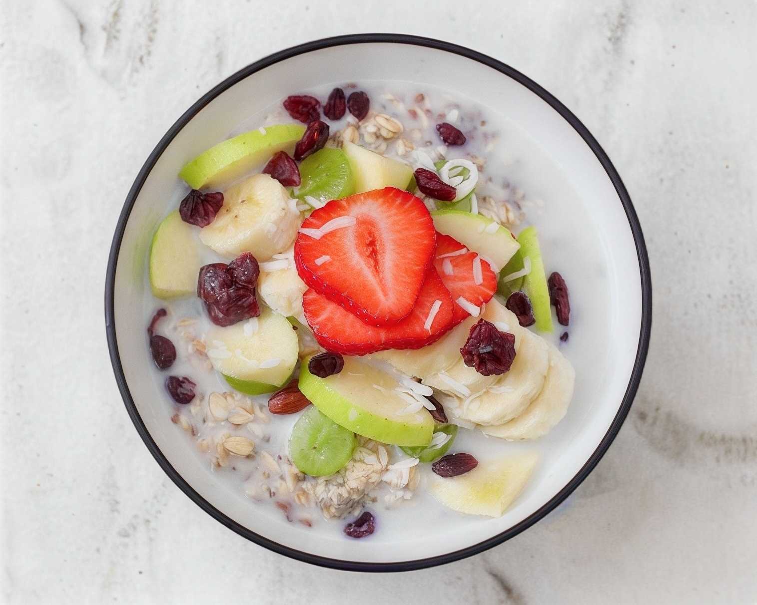 Hojuelas de avena con linaza, chía y almendras reposadas & terminada con leche, manzana, plátano y arándanos.