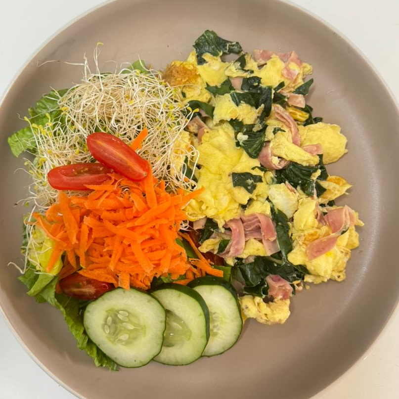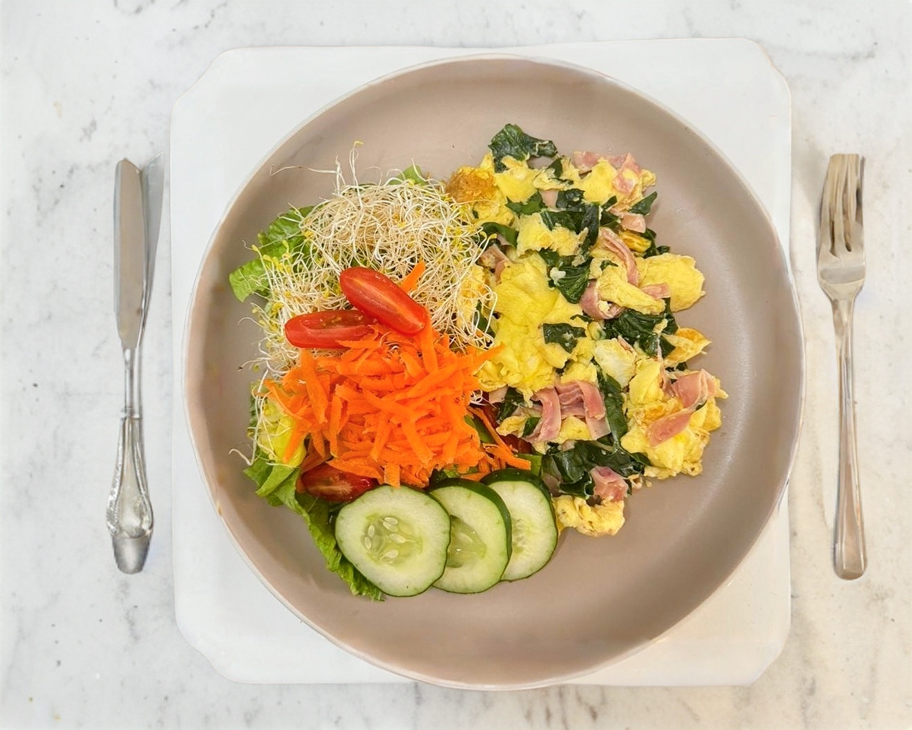 2 huevos enteros + 2 claras (acompañados de ensalada y pan tostado)