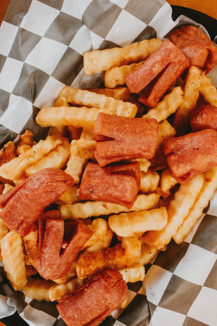250 de papas a la francesa, acompañadas de 200 grs de salchicha de pavo