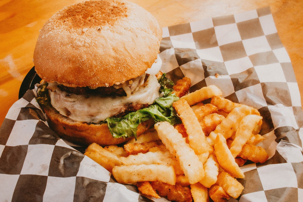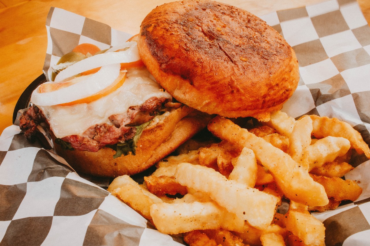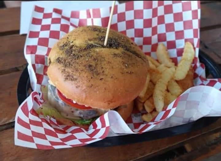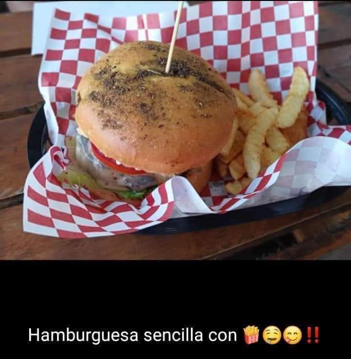 180 grs de carne de la casa, montada en pan artesanal, con lechuga, jitomate, cebolla, pepinillos y chiles jalapeños Incluye 120 grs. De papas a la francesa