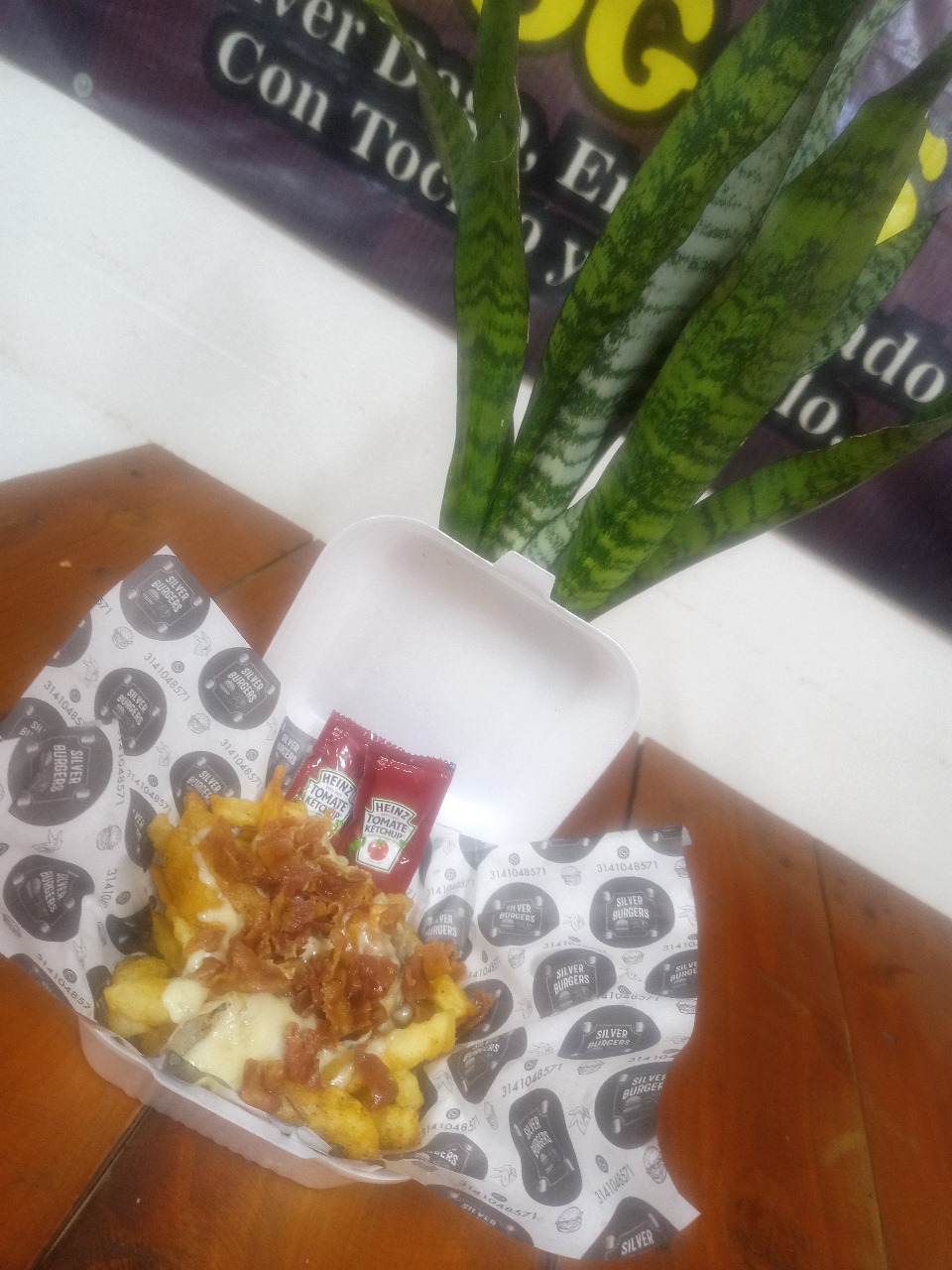 250 grs de papas a la francesa, bañadas con queso mozarella y tocino