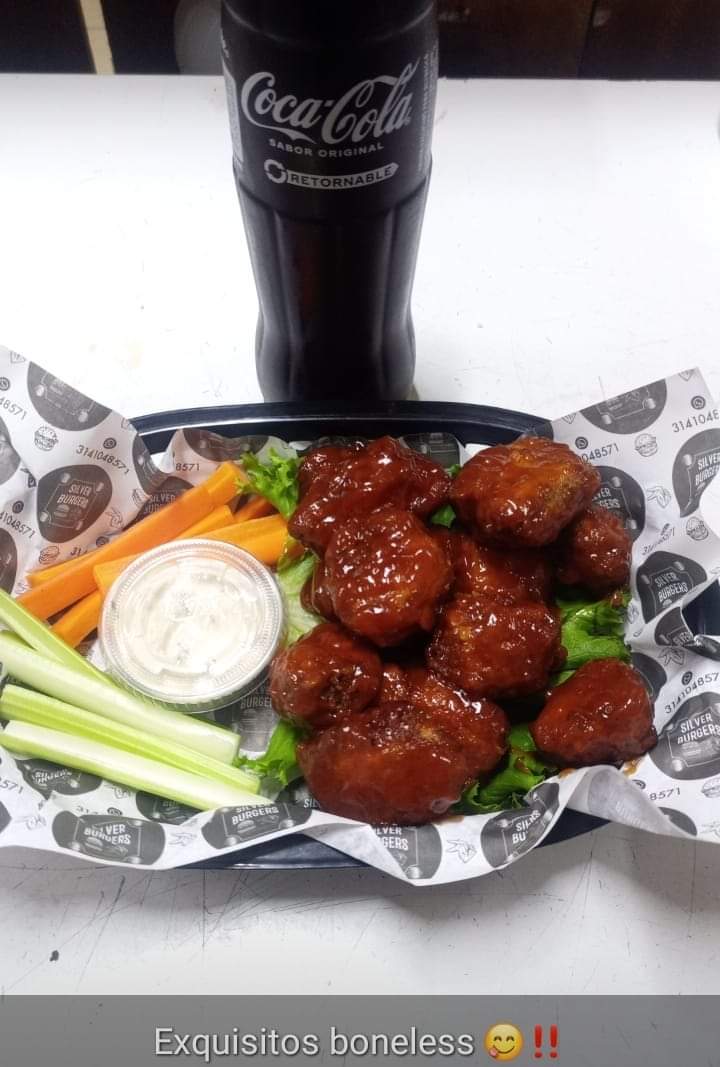 1 Hamburguesa sencilla con papas, 1 orden de boneless 6 pzas más 1 resfresco de 400 ml.