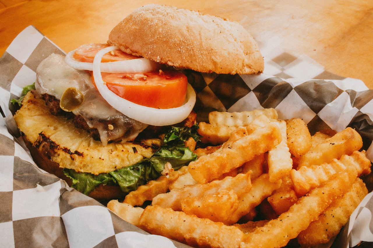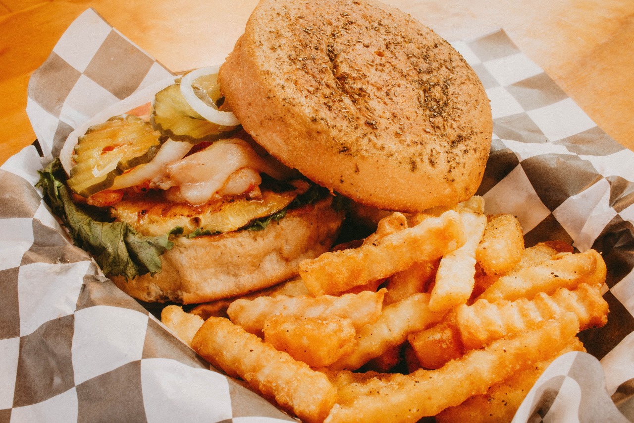 150 grs de camaron bañados con salsa mango habanero Montada piña asada, en pan artesanal con verdura y papas a la francesa