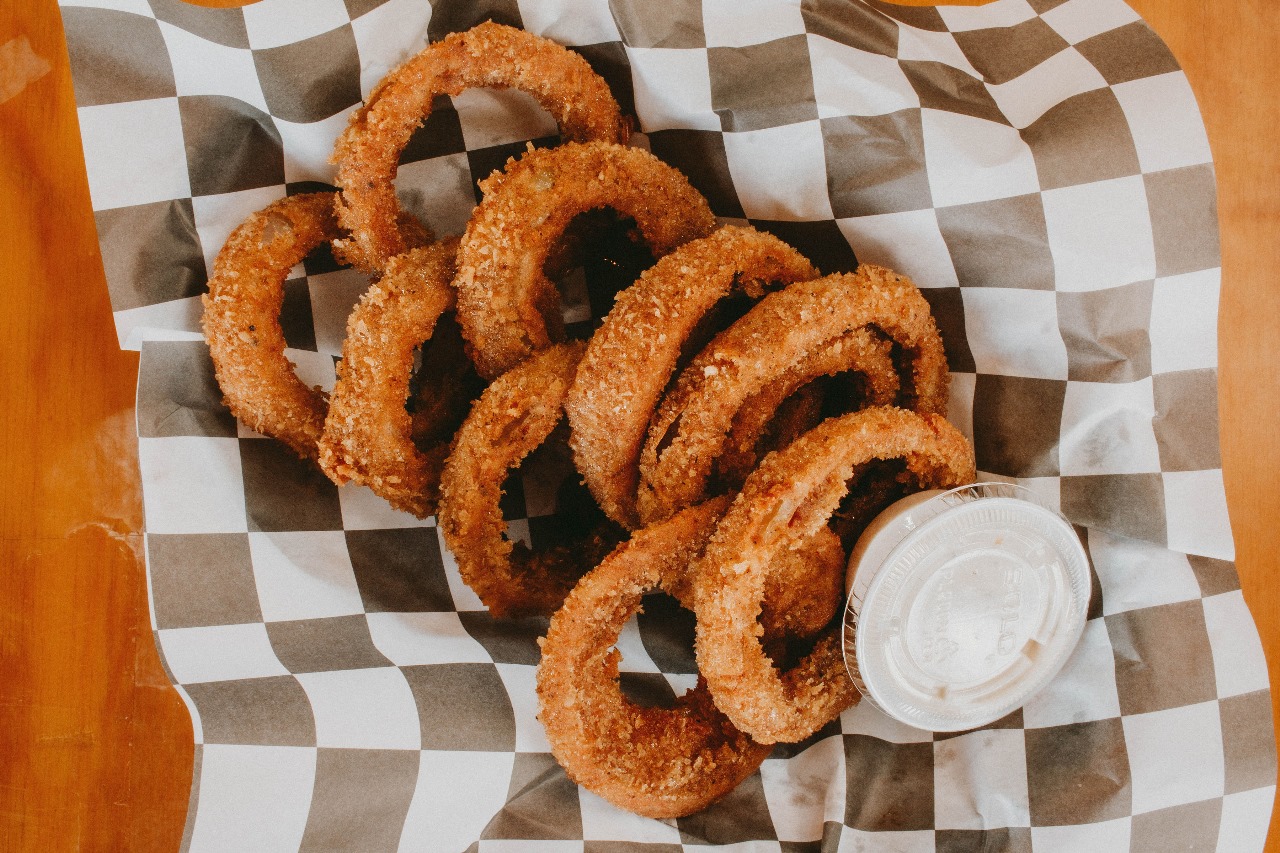 1 Hamburguesa con aros de cebolla y papas + 1 dedos de queso + 1 refresco 400ml