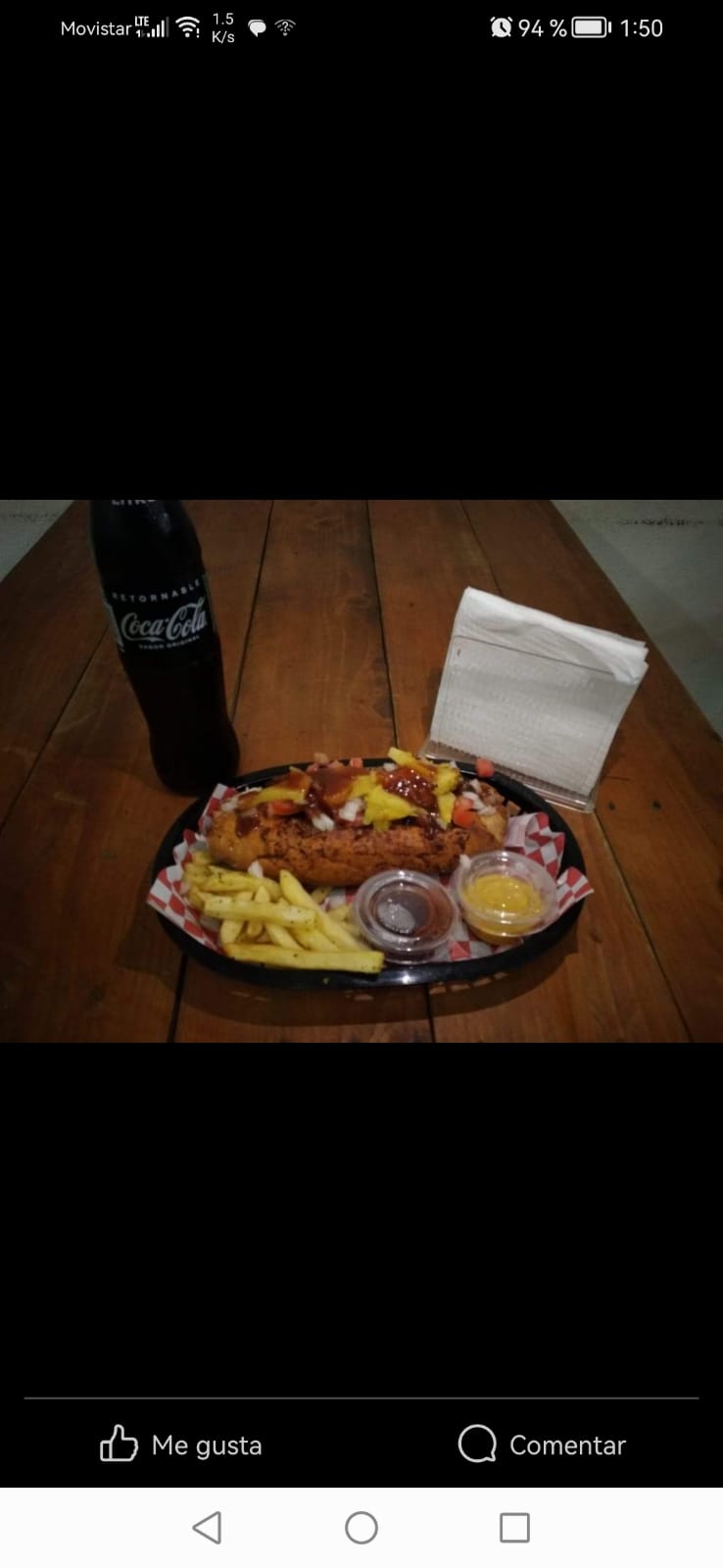 Carne de la casa relleno de queso con tocino. Bañado con salsa BBQ y pila asada