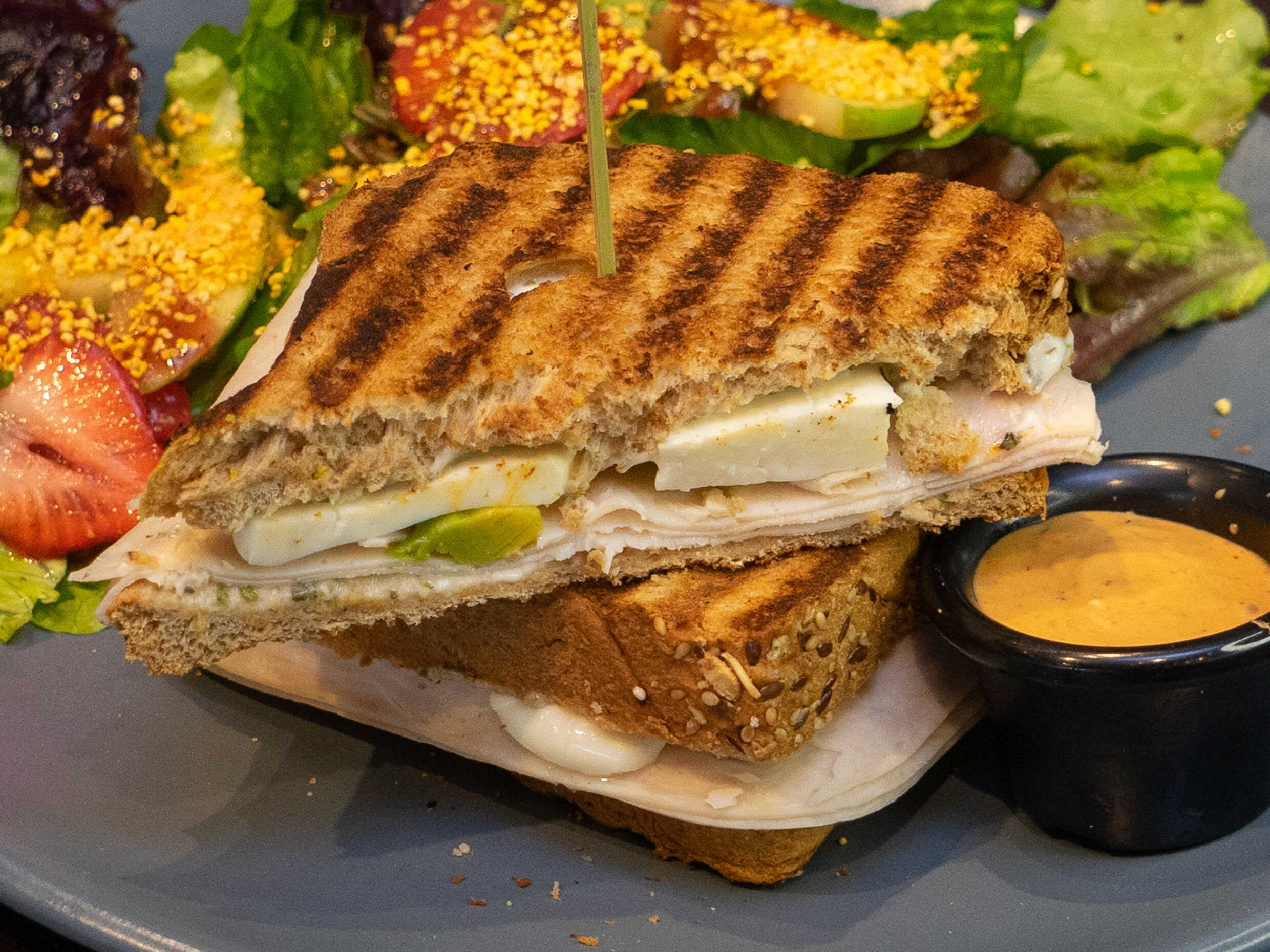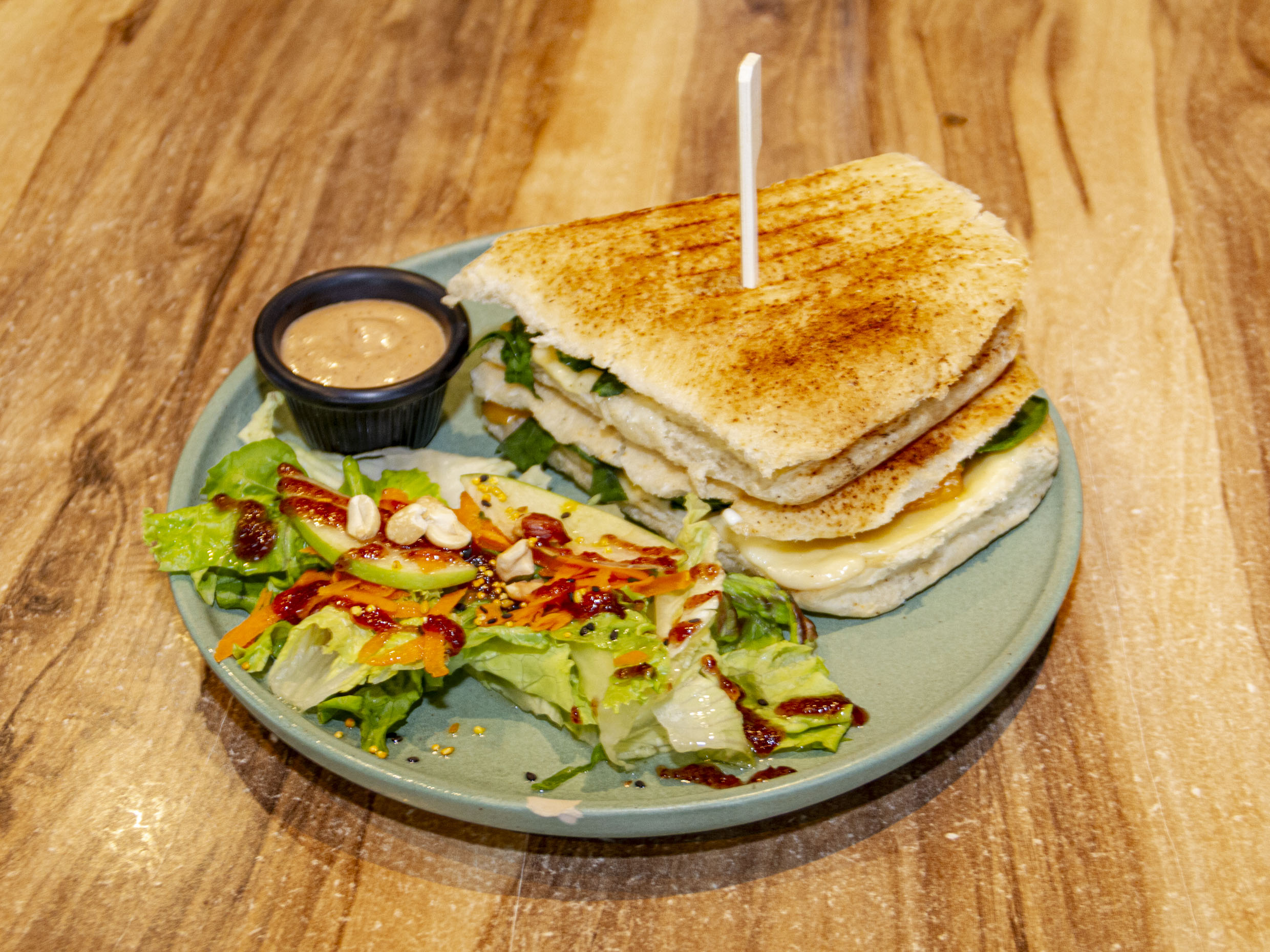 pollo a la parrilla(120g) tocino (60g)queso gouda(30g) y pesto de la casa . vienen con un complemento de mix de hojas de la casa, betabel, pepino y amaranto dulce, aderezada con vinagreta de yogurt mostaza.